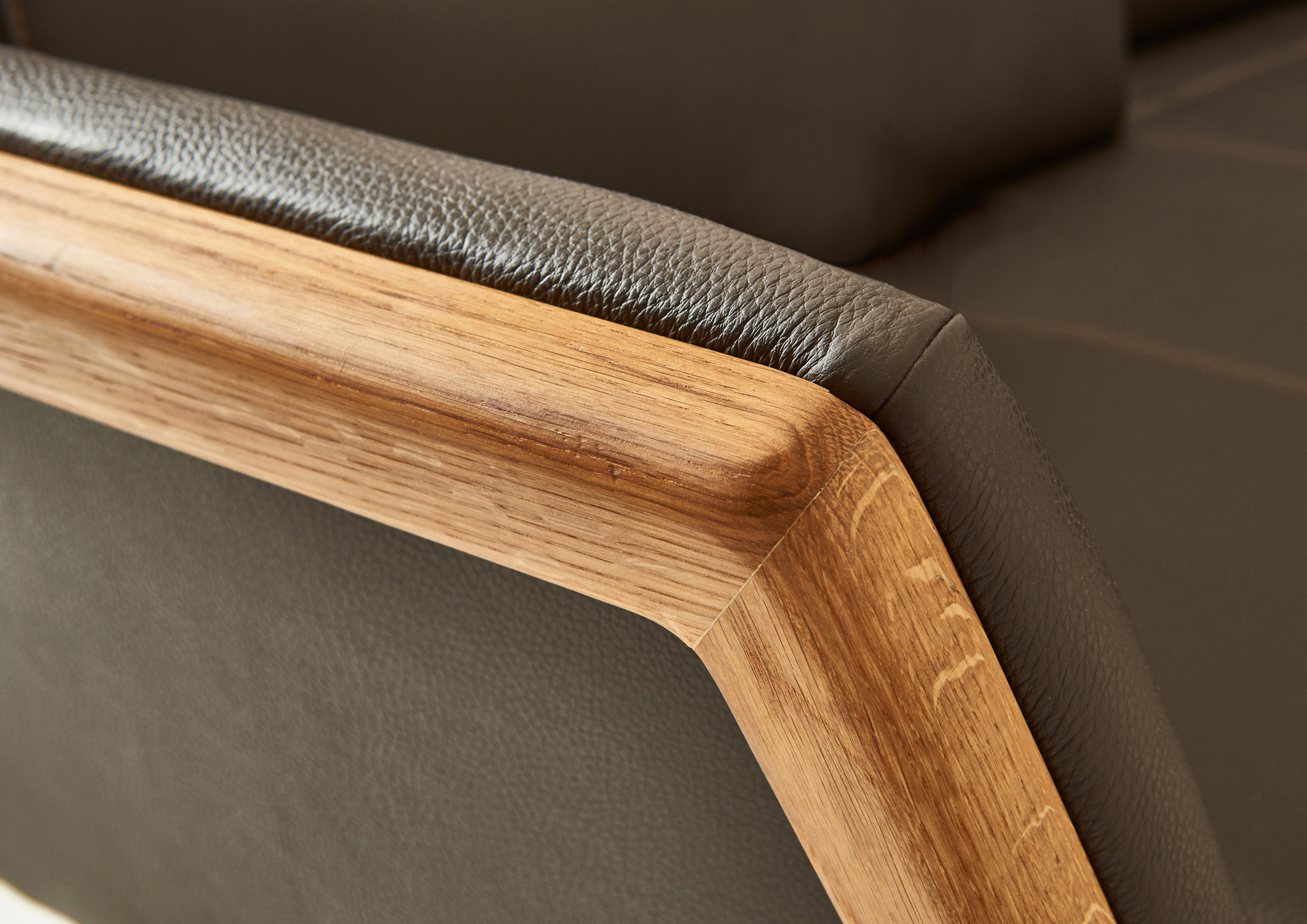 Bild 3: Dank hochwertiger Bezugsmaterialien mit aufwendig hergestellten, mehrschichtigen Polsteraufbauten können sogar organisch geformte Bauteile fließend in das Holz übergehen. Foto: IPM/Wimmer Wohnkollektionen