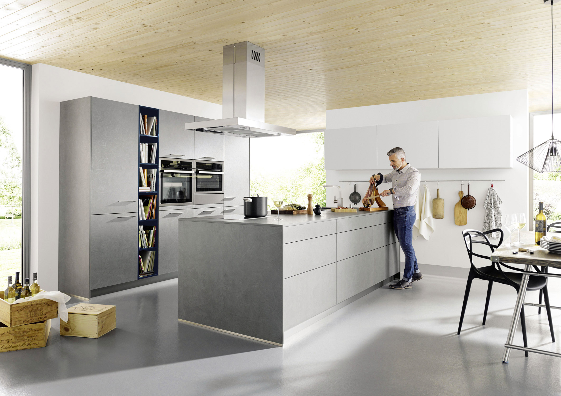 Wo Männer kochen, muss alles Wichtige griffbereit sein. Die Kücheninsel in Betonoptik passt zum beinahe steril wirkenden Ambiente ohne viel Dekoration. (Foto: AMK)