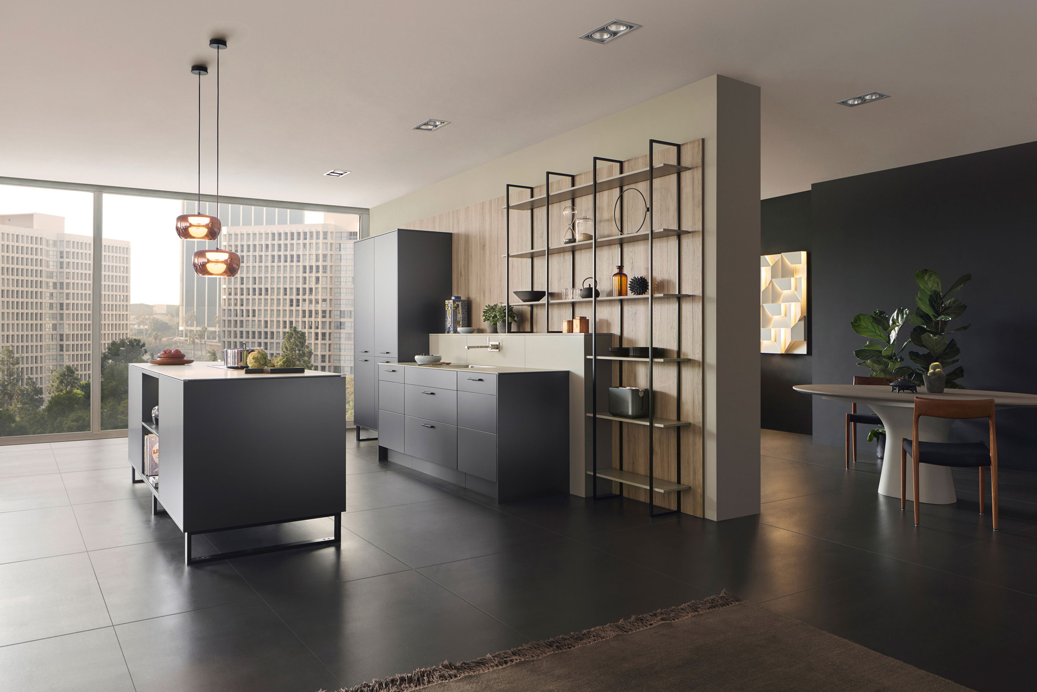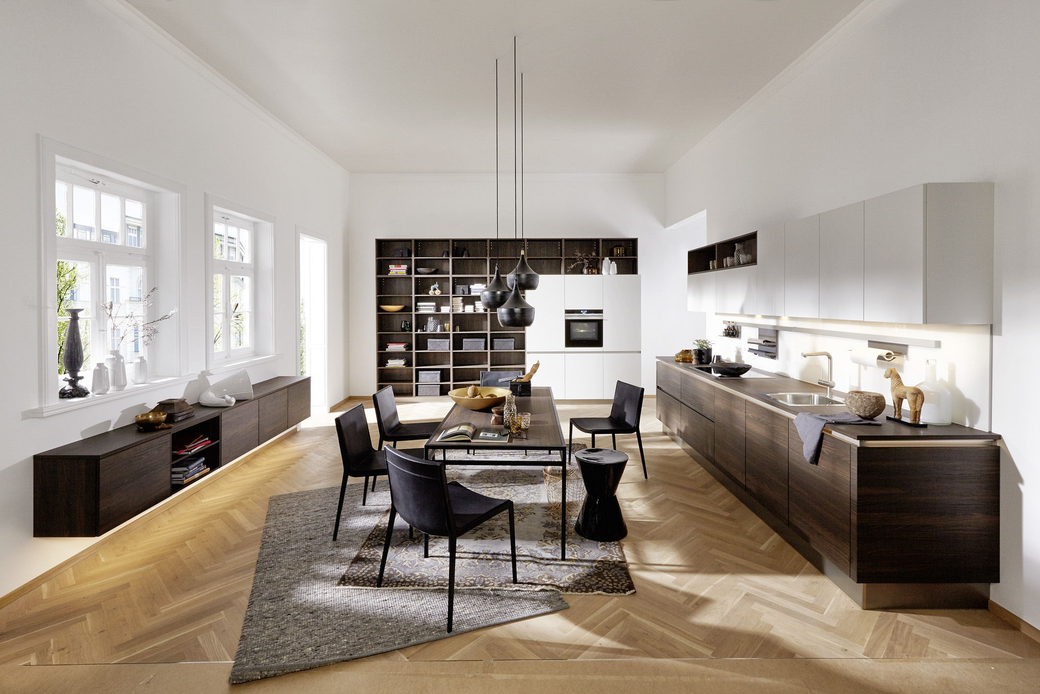 Als verbindendes Element zwischen der Küche und dem Essbereich dienen beispielsweise High- und Lowboards, die im Hinblick auf Design, Materialien und Dekore optimal auf die Küche abgestimmt sind. Dabei werden häufig weiße Lackoberflächen mit Hölzern kombiniert. Besonders angesagt ist derzeit dunkles Eichenholz. Im Trend liegen zudem die Farben Grau, Braun und Schwarz. Aber auch filigrane Regale – an der Wand oder mittig als Raumteiler platziert – können die Brücke zwischen Küchen- und Wohnraum schlagen. Kommt als Material Metall zum Einsatz, sorgt dies zusätzlich für eine ansprechende Loft-Atmosphäre. Â