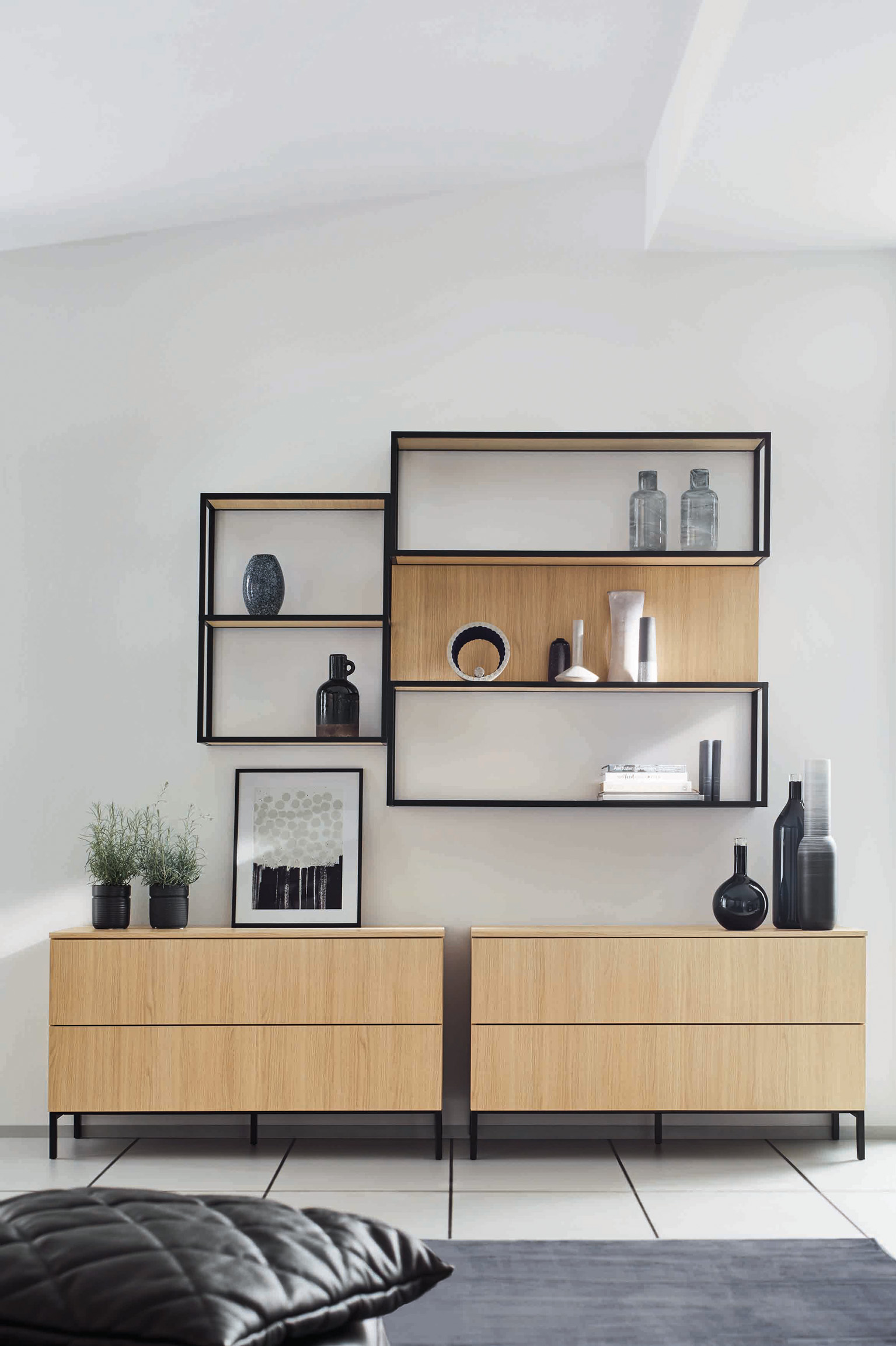 Mit ihrem übergreifenden Gestaltungs- und Planungsansatz eröffnen die Küchenanbieter auch für den Wohnbereich vielfältige Optionen. Für Wohnlichkeit sorgen hier etwa Vitrinen mit gefärbtem Glas, durch welches die Accessoires oder das Geschirr hindurchscheinen. Viel Stauraum bieten moderne Sideboards, TV-Möbel und individuell geplante, puristische Wohnwände. Zugleich sorgen beleuchtete Wandborde für eine warme Atmosphäre. Durch wiederkehrende Materialien, Formen und Farben ergibt sich dabei ein schlüssiger Gesamteindruck des offenen Koch-, Ess- und Wohnbereichs.