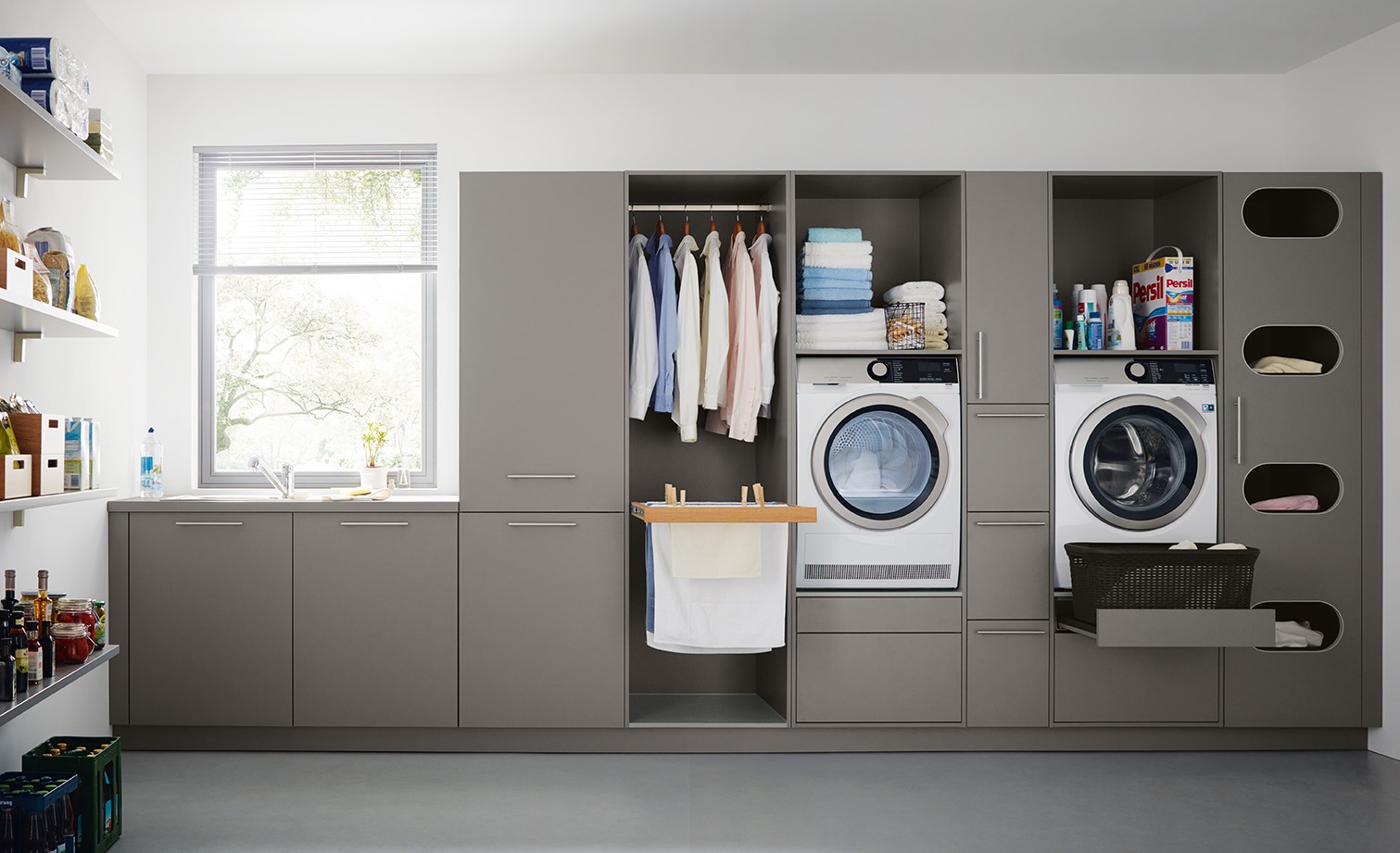 Clevere Lösungen bieten die Küchenmöbelhersteller auch für Hauswirtschaftsräume an, über die viele Wohnungen inzwischen verfügen. Diese haben nicht mehr viel gemein mit dem kleinen Raum am Ende eines langen Gangs, in dem früher all das untergebracht wurde, was in der guten Stube nichts zu suchen hatte. Heutzutage werden diese Zimmer deutlich effizienter genutzt. Eingebettet in ein ansprechendes Wohnkonzept und ausgestattet mit perfekt auf die Bedürfnisse abgestimmten Möbeln entfaltet ein Hauswirtschaftsraum erst seine wahren Vorteile. Intelligente Ordnungssysteme ermöglichen eine sichere und platzsparende Aufbewahrung. So lässt sich etwa Schmutzwäsche in einem Einbau-Wäschesammler verstauen, der über einen Auszugschrank bequem zugänglich ist.