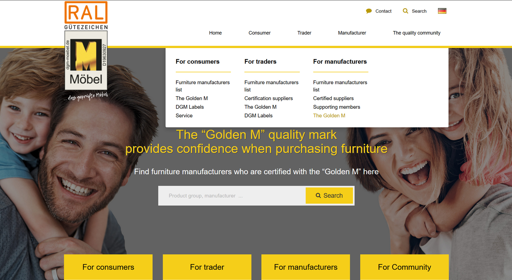 Neben dem âGoldenen Mâ vergibt die DGM weitere QualitĂ€tszeichen fĂŒr Möbel, wie das Emissionslabel, das Boxspringlabel und das Klimalabel. HierĂŒber hĂ€lt die Homepage nun auch Informationen in englischer Sprache bereit. Ebenso können die Besucher der Webseite einsehen, mit welchen Zertifizierungen die mehr als 130 deutschen und europĂ€ischen Mitgliedsunternehmen der DGM ausgezeichnet sind. Rund 100 Mitglieder sind Möbelhersteller, hinzu kommen fördernde Mitglieder wie Zulieferer und PrĂŒfinstitute. Seit 1963 mĂŒssen alle Möbelhersteller die strengen GĂŒte- und PrĂŒfbestimmungen RAL-GZ 430 einhalten, um DGM-Mitglied und mit dem âGoldenen Mâ ausgezeichnet zu werden. âDie DGM ist eine starke Gemeinschaft mit einem klaren Ziel: MöbelqualitĂ€t! DafĂŒr werden wir mit unserer englischsprachigen Webseite nun auch international noch besser werben und sensibilisieren könnenâ, schlieĂt Winning. DGM/FT