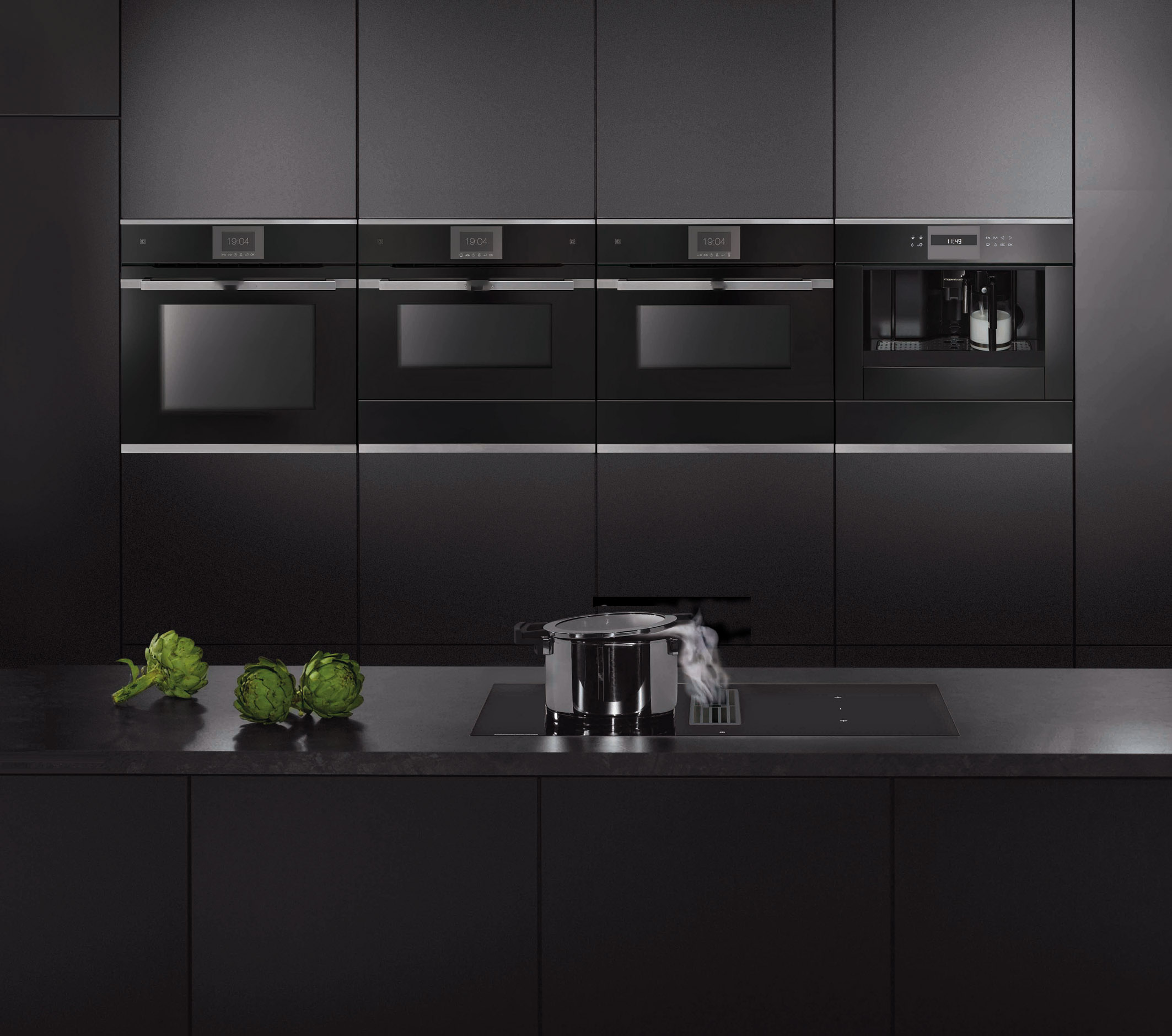 Ein attraktives Einbau-Gespann in ergonomischer Griffhöhe. Unter dem Kompakt-Kaffeevollautomaten (links) mit Touch-Bedienung und einer Antifingerprint-Edelstahloberfläche befindet sich eine Wärmeschublade. (Foto: AMK)