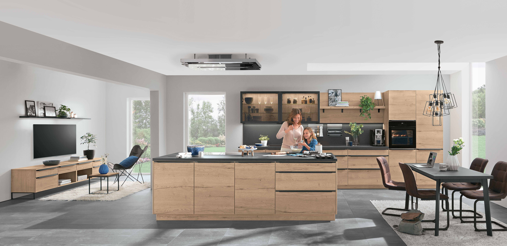Ruhe, Natürlichkeit und Individualität strahlt diese Familien-Wohnküche in Holz-Dekor aus. Der Grundriss ermöglicht eine freistehende Insel und einen großzügigen Esstisch, der sich im Nu in einen Arbeitsplatz verwandelt. (Foto: AMK)