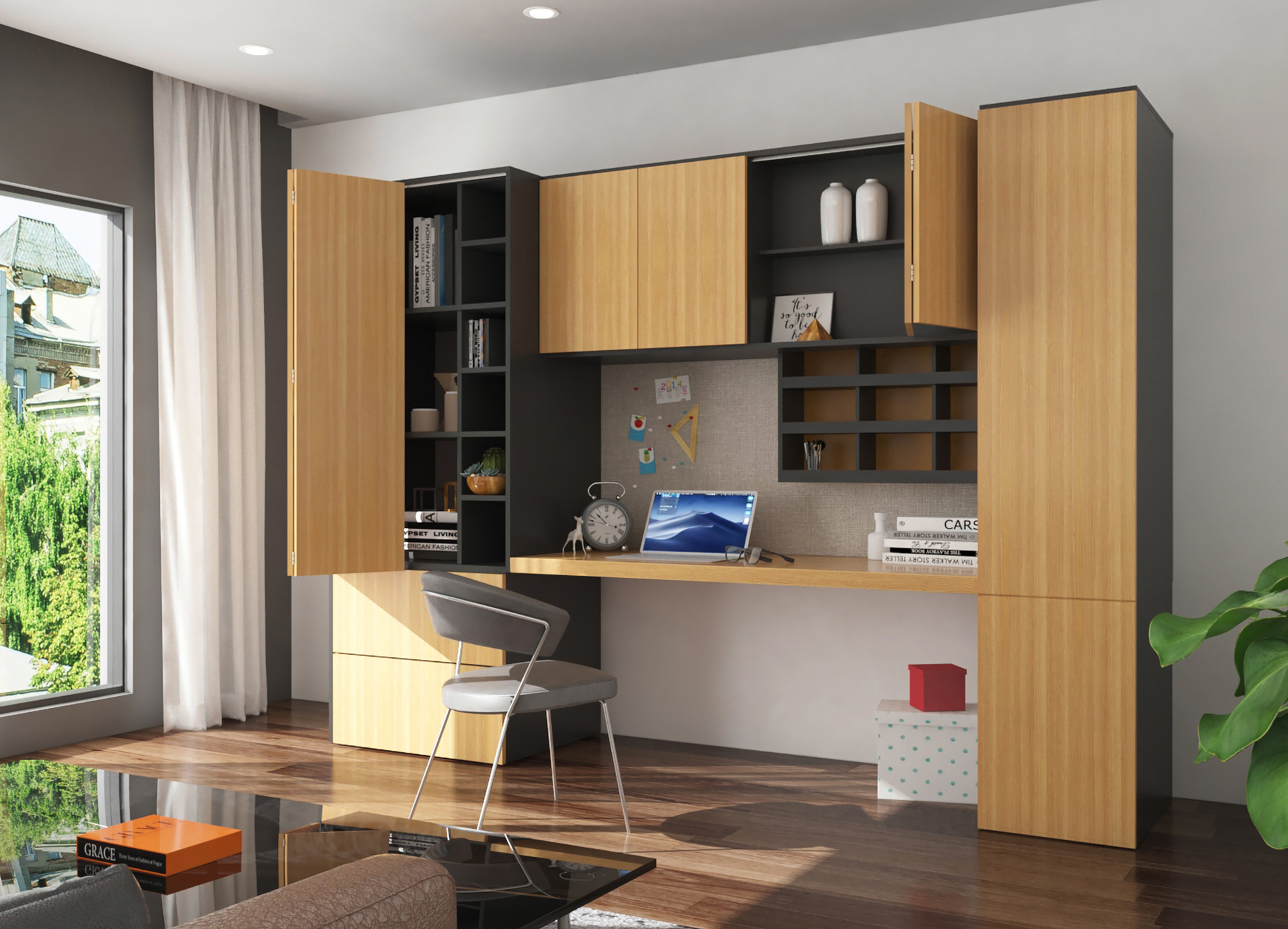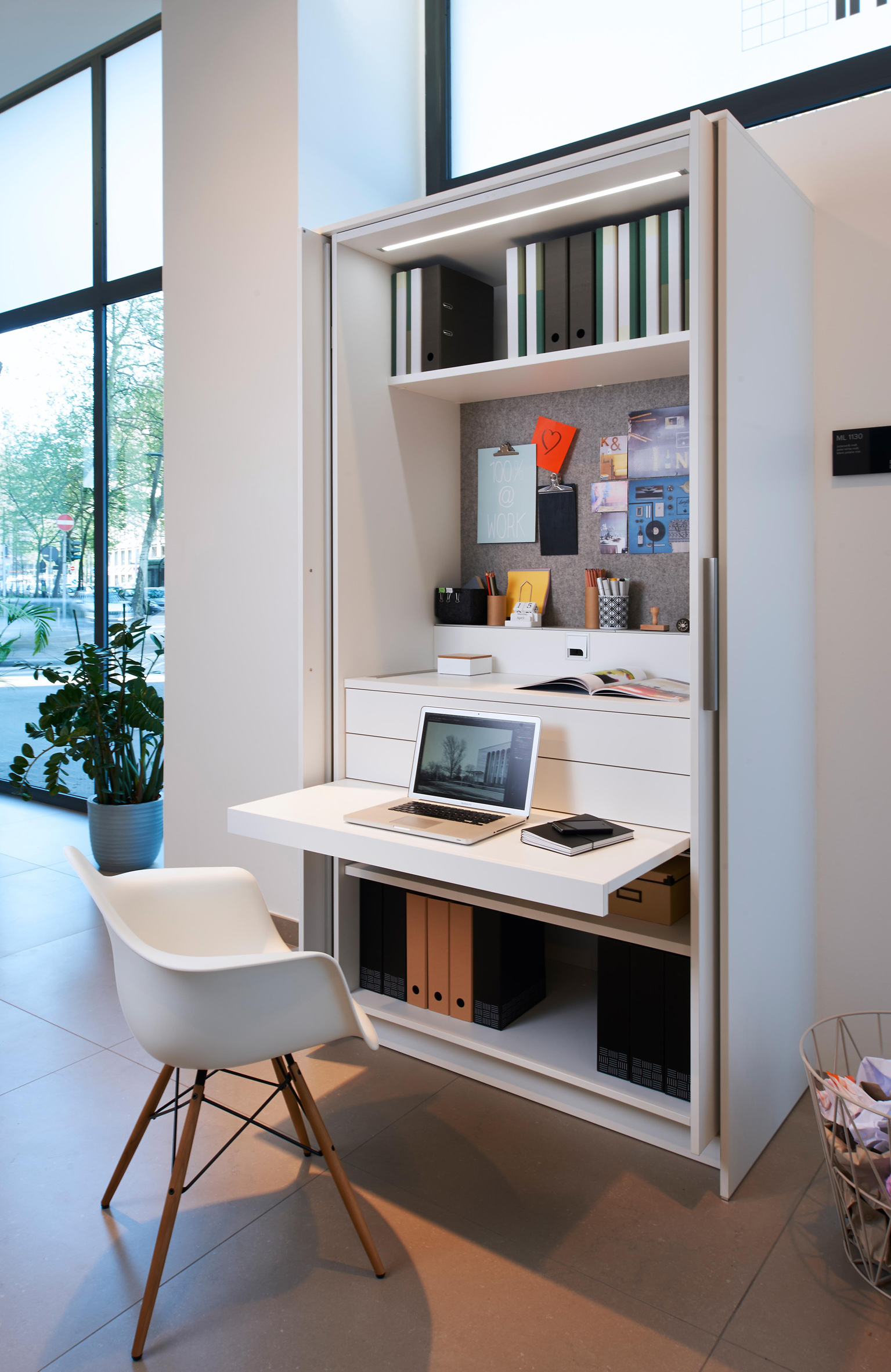 Geschäftig wie im Büro und so ruhig wie zu Hause, z. B. mit dieser wandlungsfähigen Lösung mit schnellem Zugriff. Bei Arbeitsende können die Büroutensilien unsichtbar hinter den Falttüren verstaut werden. (Foto: AMK)