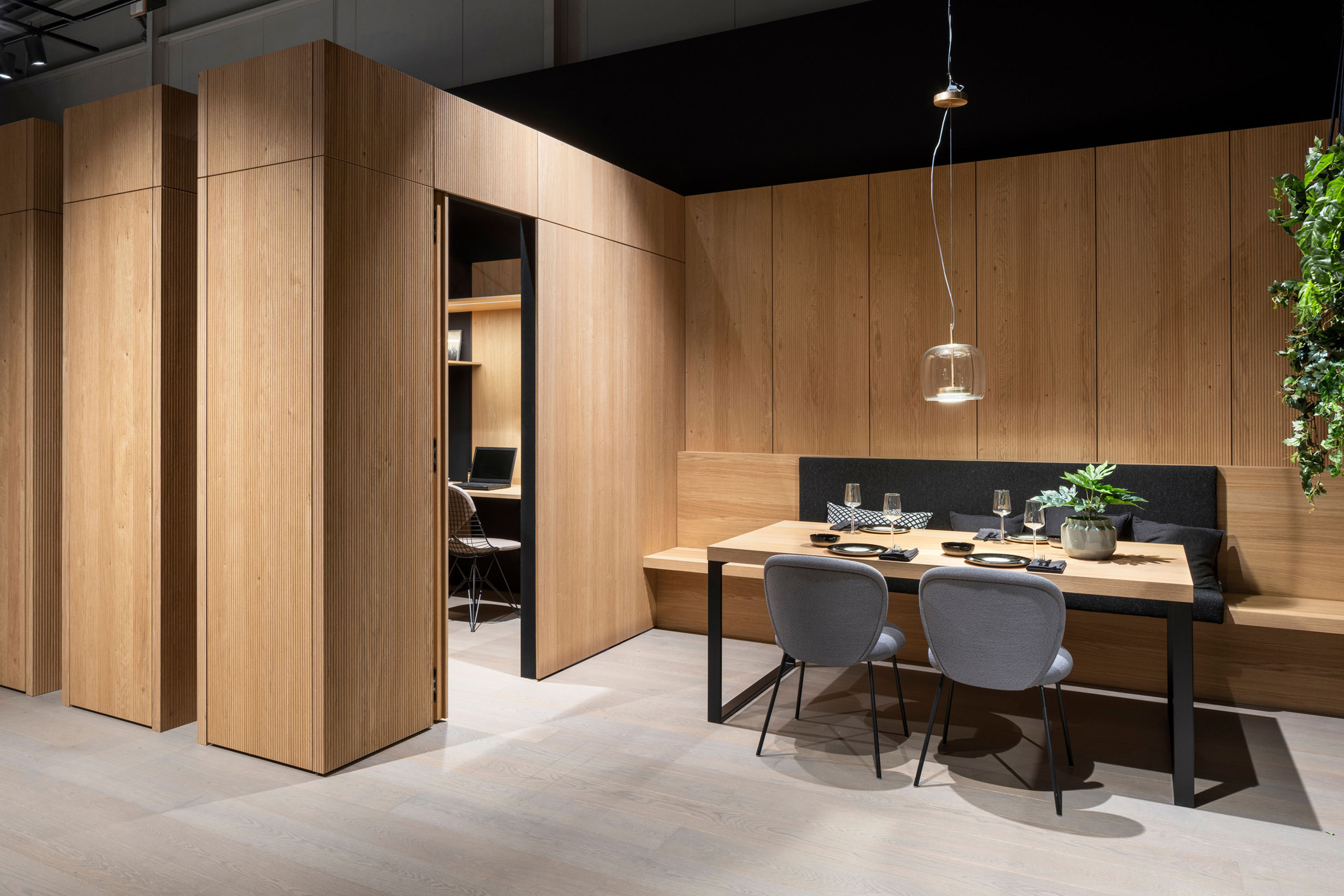Eine feine Sache sind auch die neuen Pocket Doors. Die Einschubtüren stehen nirgends im Weg und kaschieren alles, was nicht auf den ersten Blick sichtbar sein soll – z. B. einen in die Küche integrierten Home-Office-Bereich. Das funktioniert ebenso mit schwebeleichten Gleit- bzw. Schiebe- oder Falttüren. Attraktiv sind auch hochfunktionale Schränke mit Einschubtüren und speziell entwickelten Ausstattungselementen, die sie beispielsweise zu einem Büro, einer Hausbar, Tee-/Kaffeeküche oder Garderobe machen. Die 120 cm breiten Schränke lassen sich im Küchen- und Wohnbereich mit anderen Möbeln kombinieren oder als Solitäre in Übergangsbereichen platzieren. Sie fügen sich ebenso gut auch in eine Hochschrankzeile ein.
