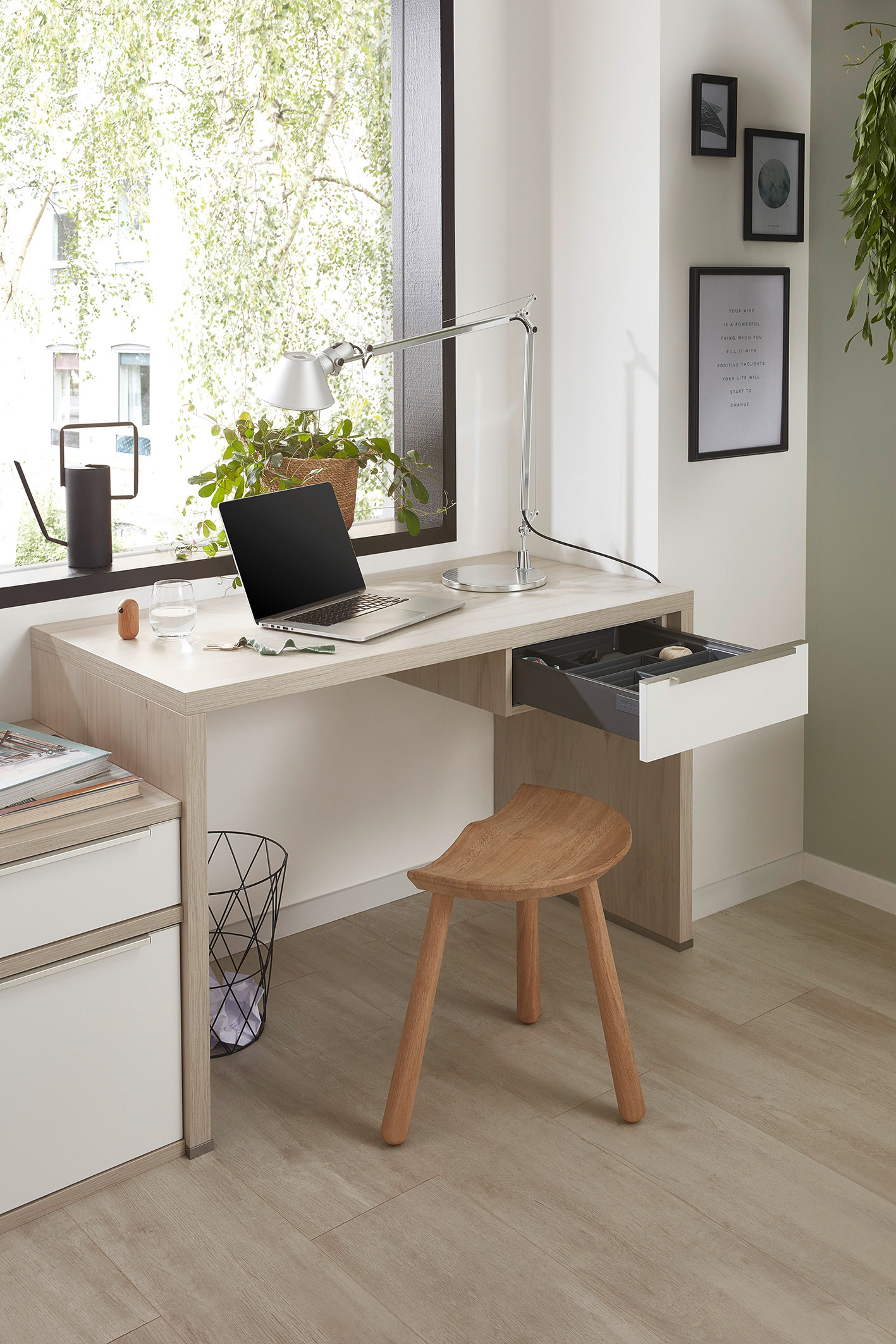 Mit wenig Aufwand wird aus einer kleinen Ecke schnell ein attraktiver Arbeitsplatz mit wohnlicher Note. Für Komfort sorgen ein Auszugstisch, reichlich Arbeitsfläche, Regale und Stauraum für das Büro-Equipment. (Foto: AMK)