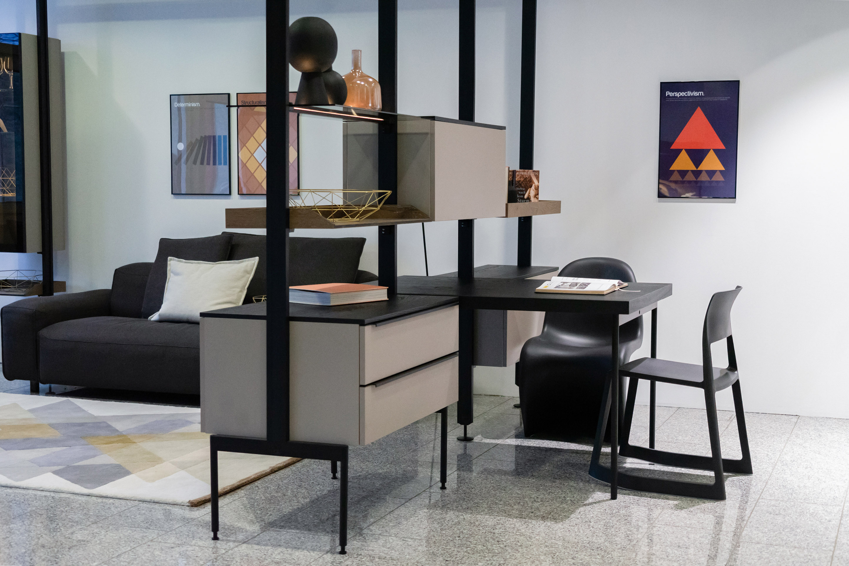 Ein Mix aus höhen- und breitenvariablen Metallstelen, z. B. zwischen Decke und Boden verspannt, Regalböden und Möbelmodulen wird zu einem vielseitigen Raumteiler, der auch als Arbeitsbereich genutzt werden kann. (Foto: AMK)
