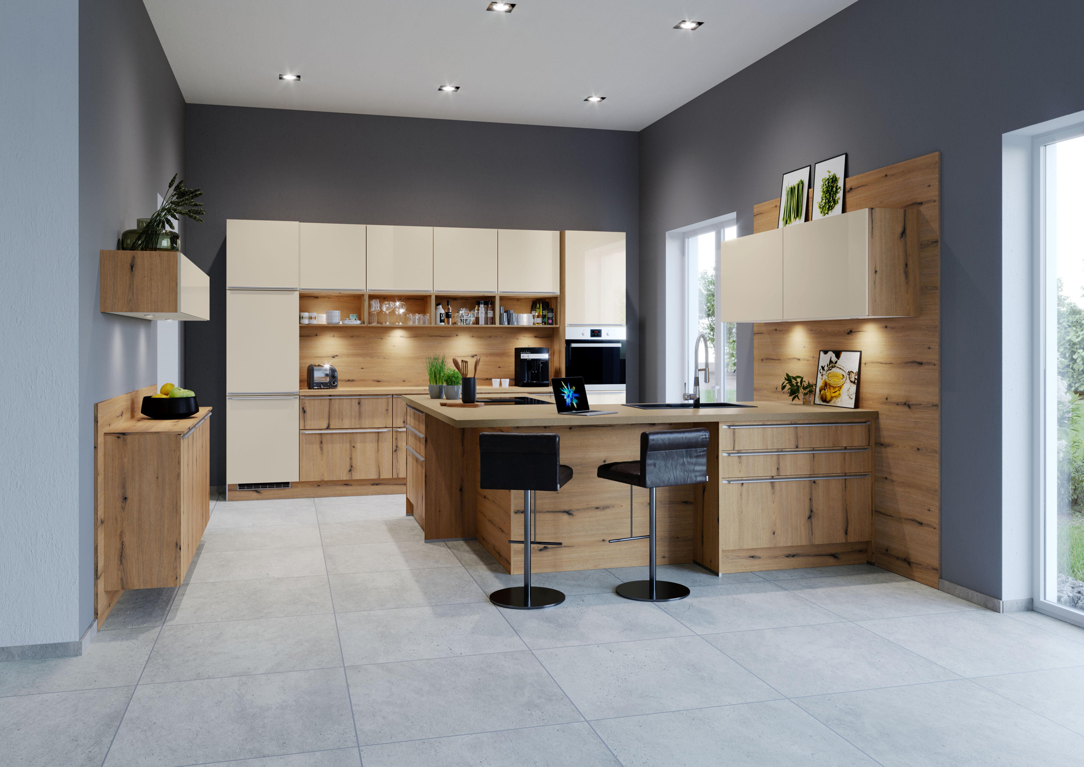 Gemütliche Wohnküche in markanter Eiche-Nachbildung kombiniert mit glänzenden, cremefarbenen Fronten sowie einer einladenden, großen Kücheninsel. Der integrierte Essbereich bietet auch Platz für Büroarbeiten. (Foto: AMK)