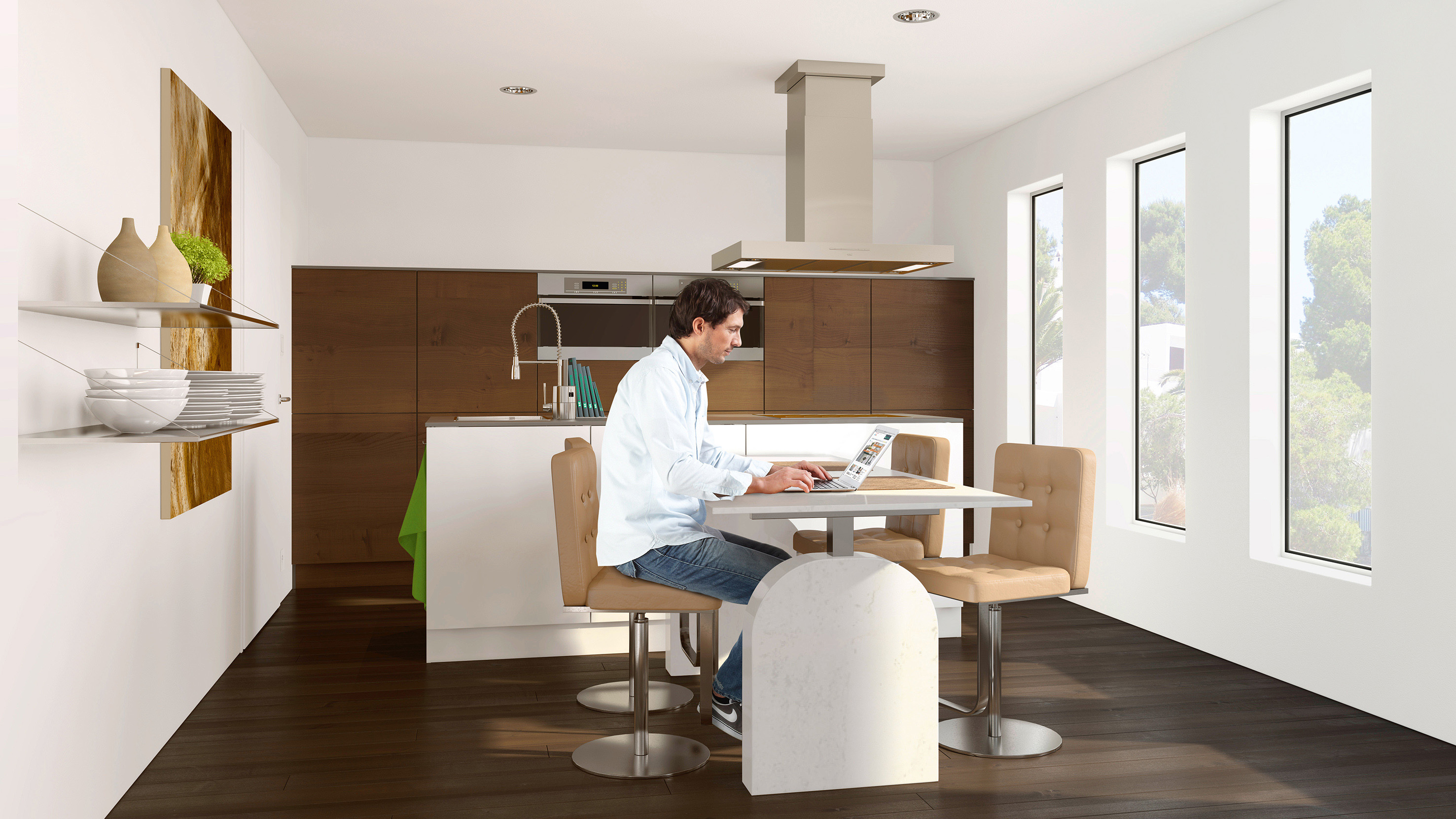 Wo viel Wert auf Ergonomie und Flexibilität gelegt wird, bieten sich sogenannte Lift- bzw. Hubsysteme an. Das können Pneumatik-Systeme sein, die per Handgriff Tische und Arbeitsplatten stufenlos verstellbar machen, so dass jeder Nutzer schnell zu seiner individuellen Wohlfühl-Arbeitshöhe findet. Oder elektrisch höhenverstellbare Antriebssysteme, die den Küchentisch auf Knopfdruck in einen Multifunktionstisch verwandeln, um ein flexibles Arbeiten im Sitzen und Stehen zu ermöglichen. Wer keine Kabel sehen möchte, lässt seinen Tisch mit einem unsichtbar integrierten Hubsystem inklusive Akku ausstatten.