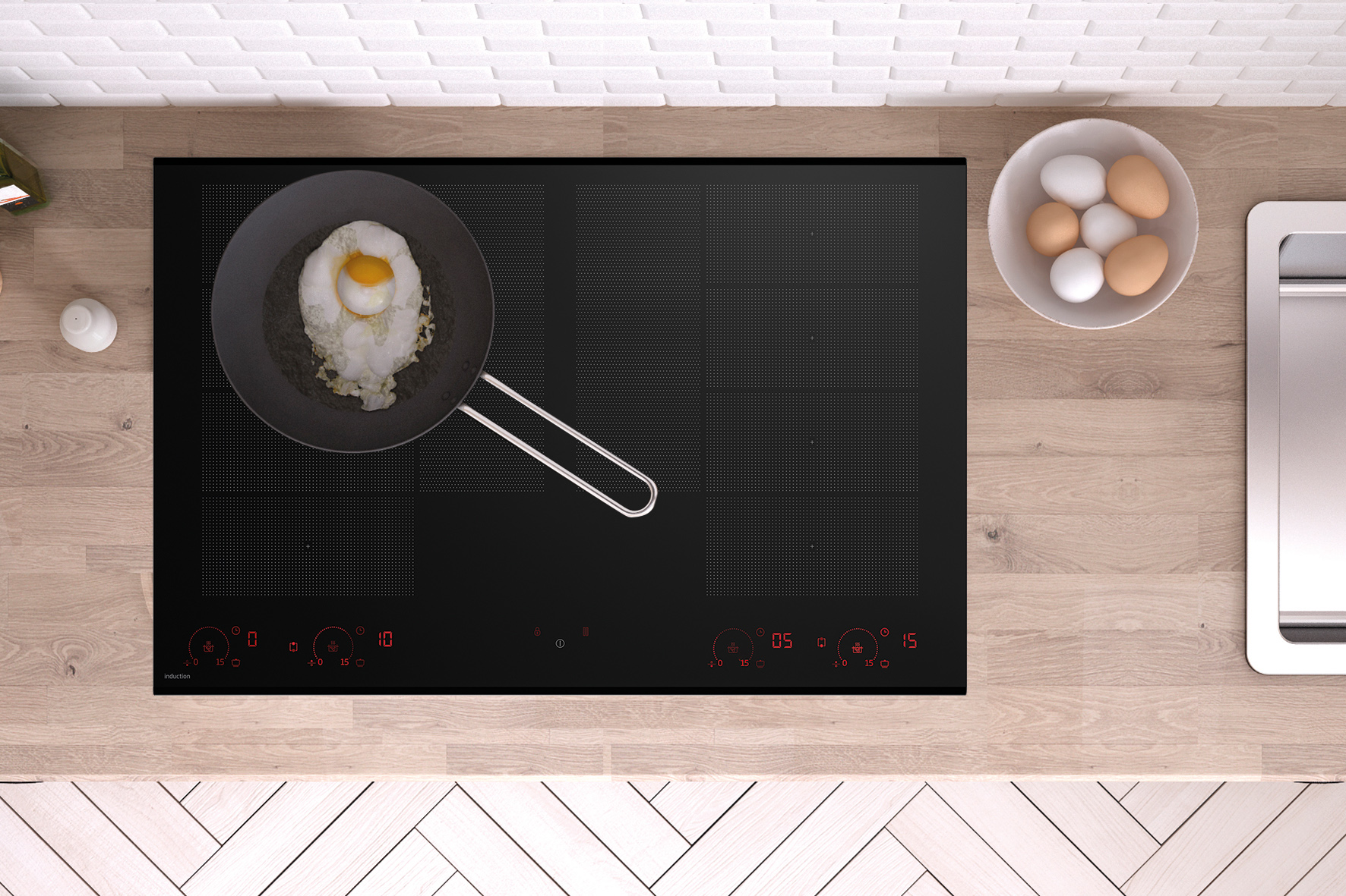 Vielseitige und flexible Flächeninduktion. Wird das Kochgeschirr bewegt oder entfernt, passt das Kochfeld die benutzten Zonen an oder geht automatisch aus. Es lässt sich auch in drei Temperaturbereiche einteilen: z. B. vorne anbraten, in der Mitte kochen und im hinteren Bereich warmhalten. (Foto: AMK)