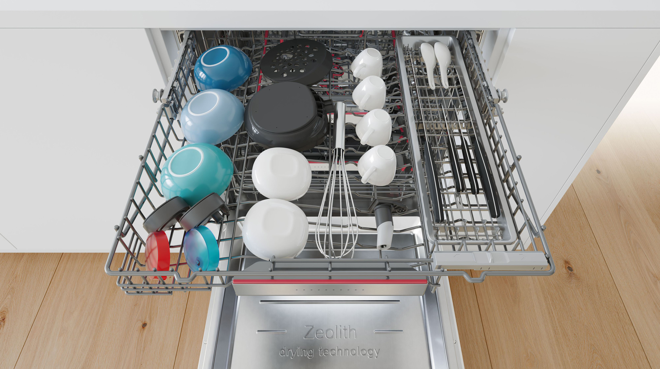 Für eine optimale Ausnutzung des Innenraums sind einige neue Spüler mit einem dritten Korb – über dem oberen Spülkorb – ausgestattet. Er nimmt Kleinteile auf wie z. B. Espressotassen, Müsli-Schalen, Kochbesteck und kleine Plastikschälchen. Ein spezielles Design sorgt dafür, dass das Spülgut während des Reinigungsprozesses auch an Ort und Stelle bleibt und weder verrutscht noch sich verdreht, wie es bei kleineren Geschirrteilen aus Kunststoff vorkommen kann. Und da sich ein Teil des Korbs verschieben lässt, können im Oberkorb darunter sogar langstielige Weingläser oder voluminöse Weißbiergläser untergebracht werden, die dort sonst keinen Platz hätten.