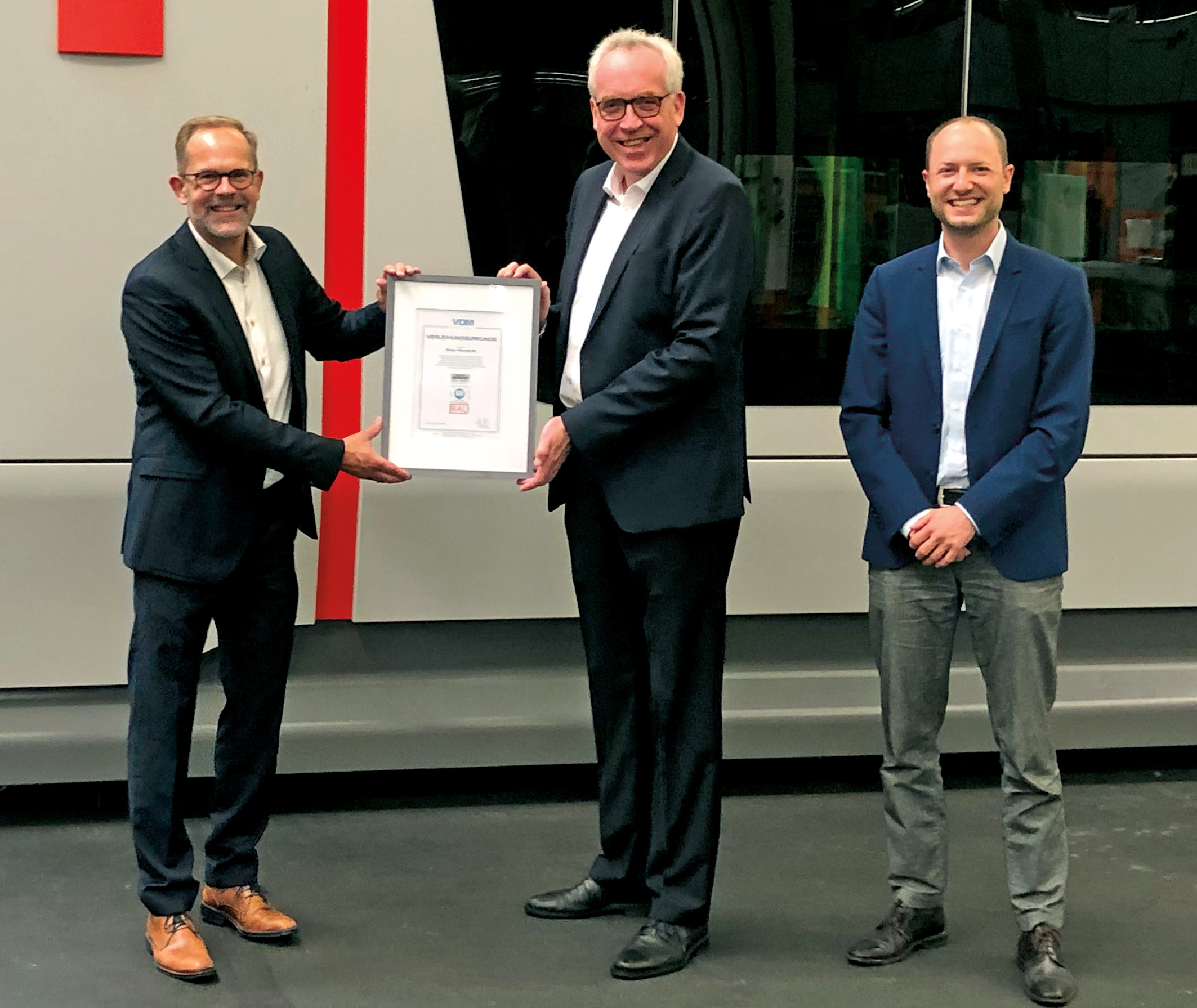 Hartmut Hagemann, Vorstandsvorsitzender von König + Neurath (Mitte), und Johannes Brennig, Nachhaltigkeitsbeauftragter (rechts), erhalten die Urkunde für „Möbel Made in Germany“ von VDM-Geschäftsführer Jan Kurth (links).