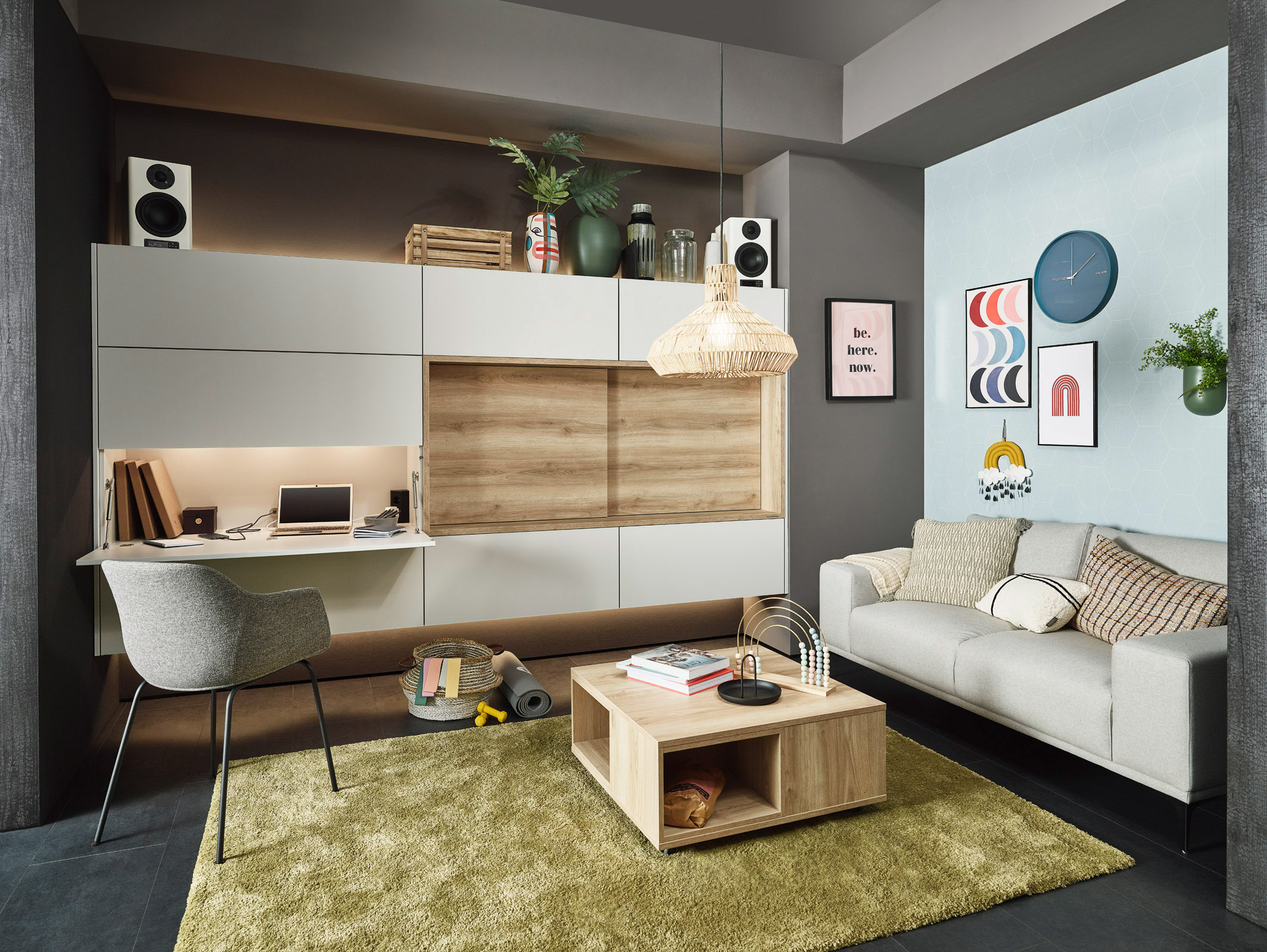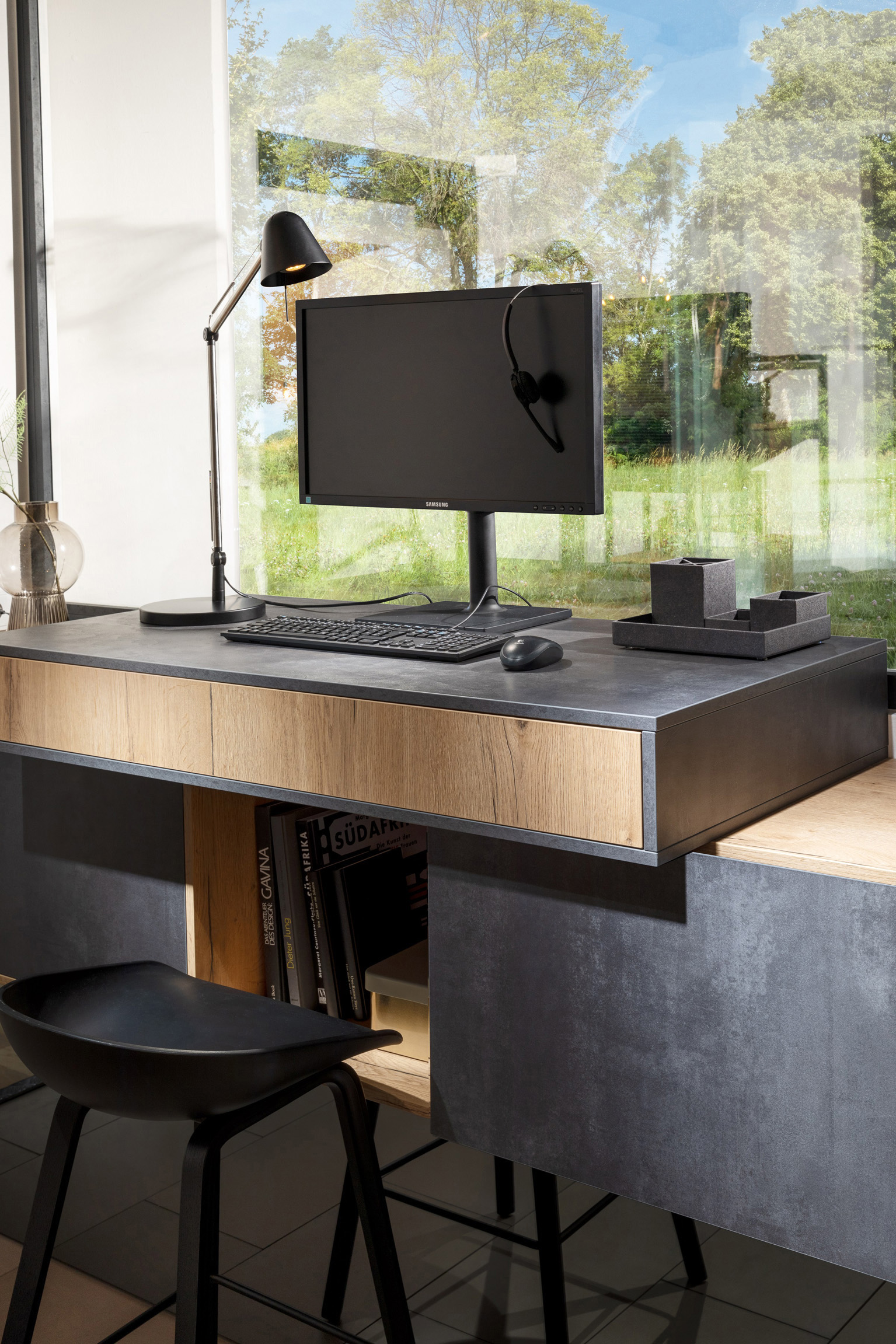 Dank einfallsreicher Ideen der Küchenhersteller lässt sich das Homeoffice sogar unmittelbar in die Küchenzeile integrieren. Möglich machen dies grifflose, hängende Küchenunterschränke, die in unterschiedlichen Höhen planbar sind und so eine gewisse Beinfreiheit ermöglichen. Oben darauf wird eine vorspringende Arbeitsplatte samt Schubladenauszug gesetzt, auf der das Laptop und weiteres Equipment platziert werden können. Neben viel Stauraum für Büromaterialien bietet dieses Modell auch die Möglichkeit, die Arbeitshöhe nach ergonomischen Gesichtspunkten optimal auf die Körpergröße anzupassen.