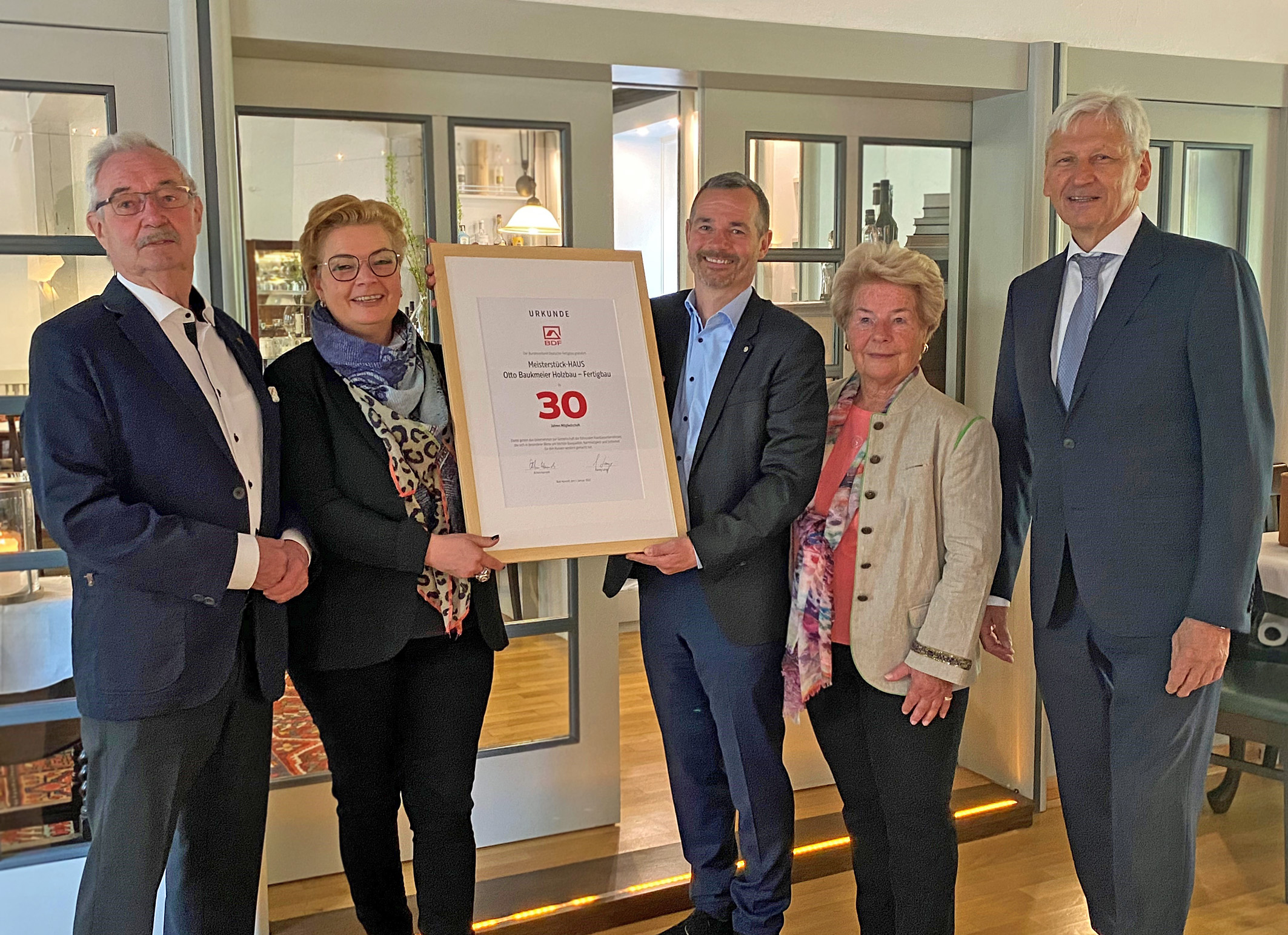 Bad Honnef/Hameln. Holz-Fertighäuser werden immer stärker nachgefragt. Einer der bekanntesten Hersteller aus Norddeutschland ist die Firma Meisterstück-HAUS aus Hameln. Bis zu 80 Häuser baut das Familienunternehmen pro Jahr. Seit 30 Jahren ist es Mitglied im Bundesverband Deutscher Fertigbau (BDF) und setzt sich im Zuge dessen für höchste Branchenstandards ein. „Wir danken Meisterstück-HAUS und allen voran der Inhaberfamilie Baukmeier für ihren Einsatz zum Wohle der gesamten Fertighausbranche“, so der BDF-Präsident Hans Volker Noller bei der Übergabe einer Jubiläumsurkunde an die Geschäftsführung um Stefanie Baukmeier und Markus Baukmeier sowie deren Eltern, den langjährigen Firmenchef Otto Baukmeier und seine Ehefrau Monika Baukmeier.