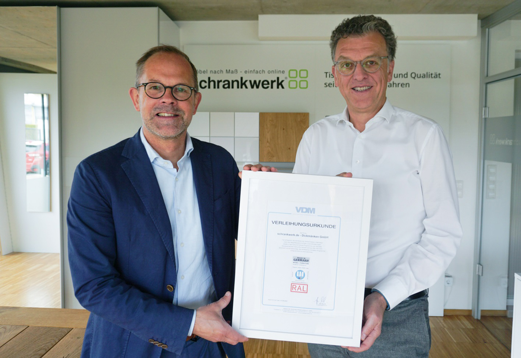 „Mit dem geographischen Herkunftsgewährzeichen ‚Möbel Made in Germany‘ möchten wir unseren Kunden die Gewissheit geben, dass sie sich auf die Qualität und Herkunft unserer Möbel verlassen können“, sagte schrankwerk-Geschäftsführer Klaus Dickmänken bei der Urkundenübergabe durch Jan Kurth, Geschäftsführer des Verbands der Deutschen Möbelindustrie (VDM). „Wir produzieren Maßmöbel für den langfristigen und nachhaltigen Gebrauch. Mit dem Label können wir dies für unsere Kunden noch sichtbarer machen und Vertrauen schaffen“, so Dickmänken weiter. Jan Kurth zeigte sich erfreut, „dass wir mit Schrankwerk einen ausgewiesenen Spezialisten für das Möbel-Onlinegeschäft im Kreis unserer Labelinhaber begrüßen können“.