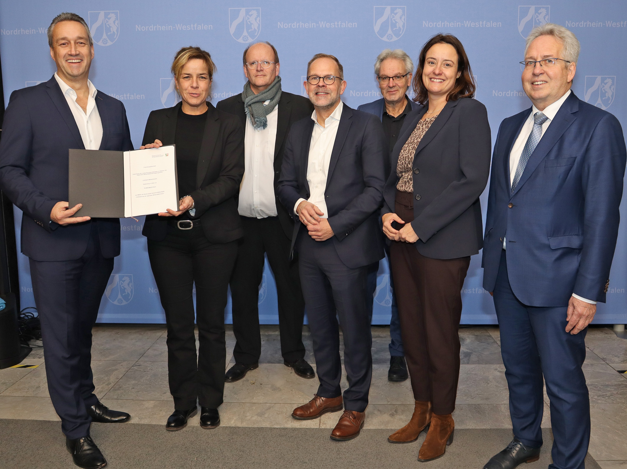 Feierliche Übergabe in Düsseldorf: VHK-Vorsitzender Andreas Wagner nimmt den Förderbescheid für die Lehrfabrik Möbelindustrie aus den Händen der nordrhein-westfälischen Wirtschaftsministerin Mona Neubaur entgegen. Über die Förderzusage freuten sich außerdem: Lehrfabrik-Projektleiter Markus Kamann, Verbandsgeschäftsführer Jan Kurth, Josef Wegener (Dezernatsleiter bei der Bezirksregierung Detmold), die Detmolder Regierungspräsidentin Anna Katharina Bölling und Landrat Jürgen Müller. (von links nach rechts) Foto: VHK