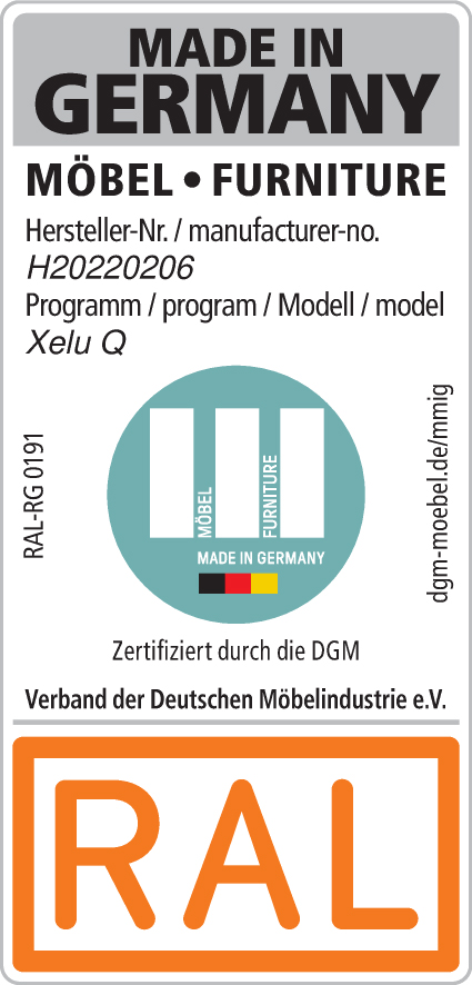 Das geografische HerkunftsgewĂ€hrzeichen âMöbel Made in Germanyâ fĂŒr das Programm Xelu Q von hansgrohe. Grafik: DGM