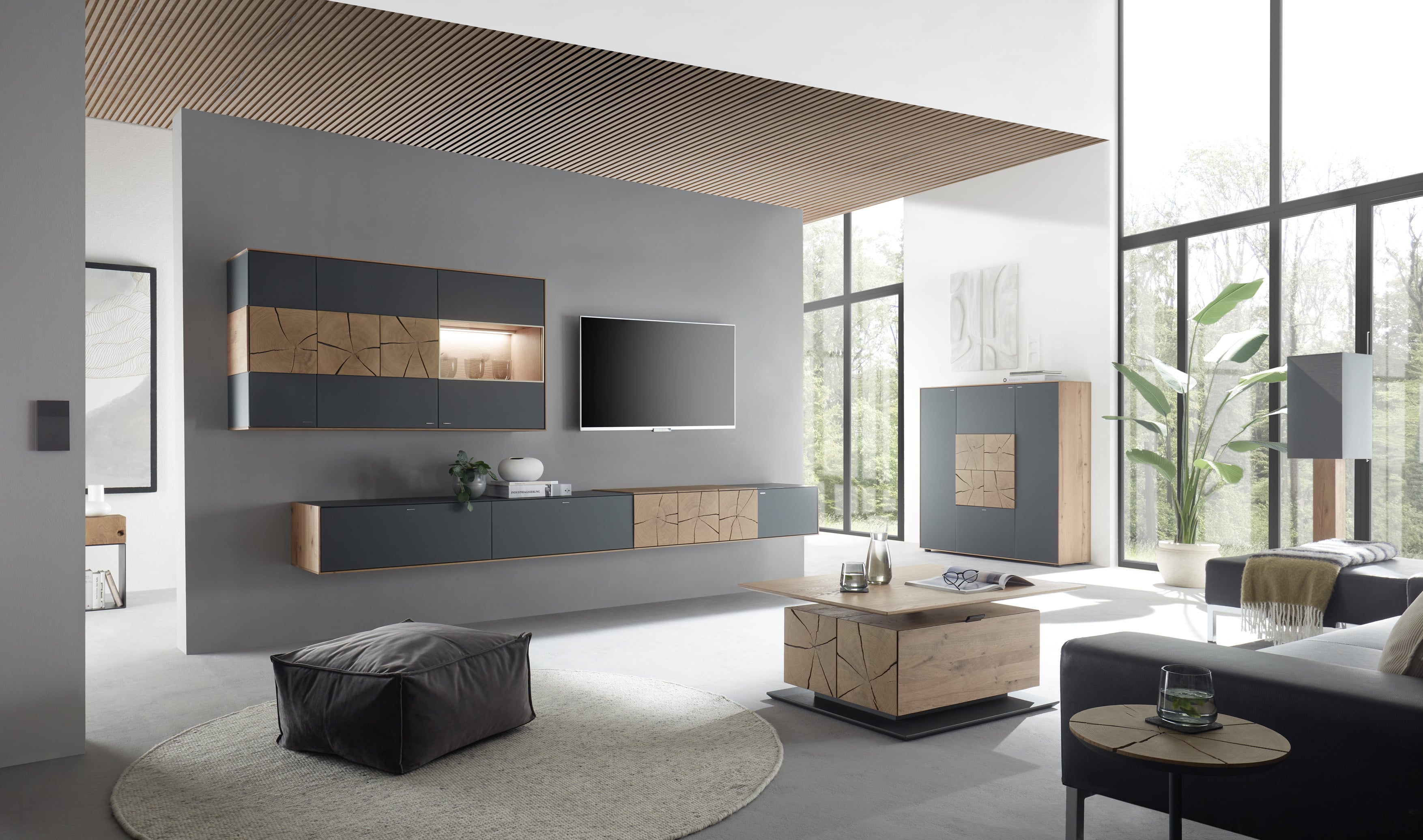 Wohnlicher Materialmix: Massive Kerneiche, Fronten aus anthrazitfarbenem Mattglas sowie Hirnholzscheiben als Hingucker. Foto: Hartmann Möbelwerke