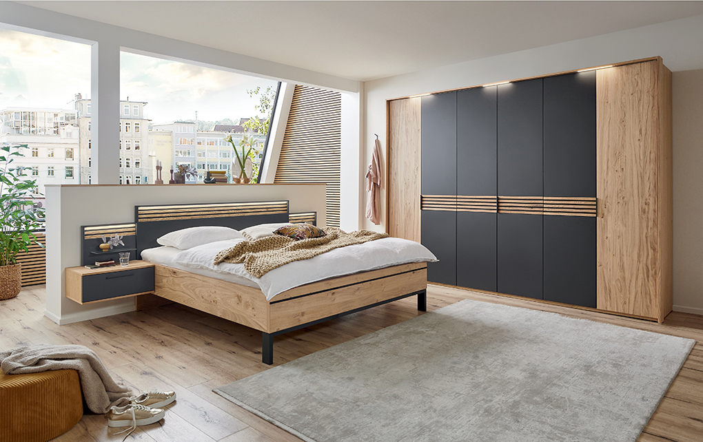 FĂĽr eine leichte, moderne Optik schweben nicht nur Betten auf schmalen Kufen oder zarten FĂĽĂźen. Das Kopfteil ist bequem gepolstert und ermöglicht ein angenehmes Anlehnen. Oft wird beim Kopfteil aber auch bewusst das Material Holz betont, etwa durch den Einsatz von massiven Lamellen, die NatĂĽrlichkeit und Handwerkskunst vermitteln. Kleiderschränke sind häufig mit SchiebetĂĽren versehen oder neuerdings auch mit einer textilen Front, die per Tastsensor hoch- und runtergefahren wird. Die Innenausstattung der Schränke lässt sich auf den individuellen Bedarf anpassen, etwa durch Kleiderlifte, Fächer fĂĽr Krawatten, AuszĂĽge fĂĽr Handtaschen oder stoffbezogene Tablare fĂĽr Schmuck. Weiche Kissen und kuschelige Wolldecken runden das Bild ab. Â