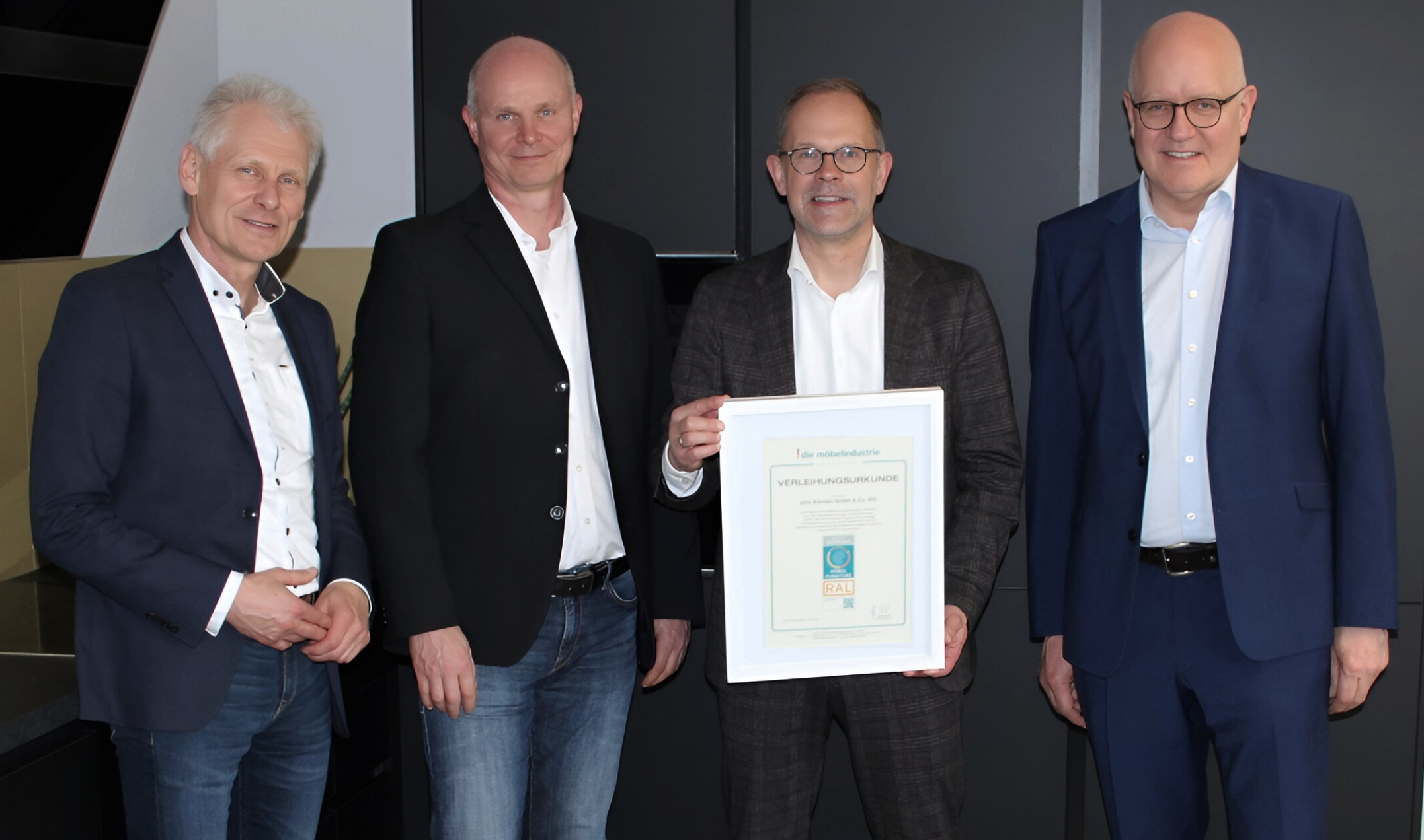 VDM-Geschäftsführer Jan Kurth (zweiter von rechts) überreicht die Urkunde für „Möbel Made in Germany“ an die Pino-Geschäftsführer Geschäftsführer Jörg Deutschmann, Heiko Drost und Frank Eberle (von links nach rechts). Bild: Pino