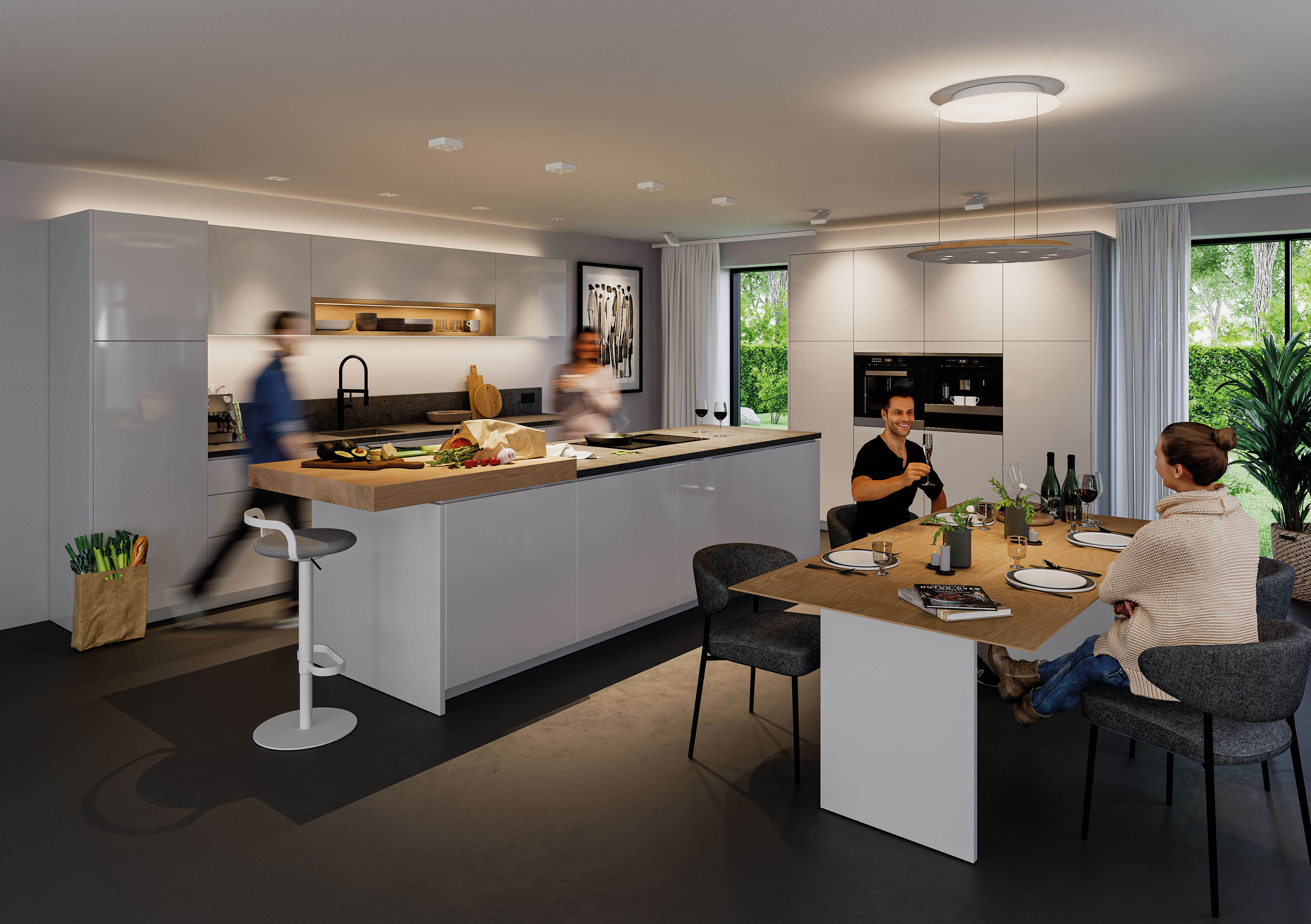 An Beleuchtungslösungen in einer Wohnküche knüpfen sich heute viele zusätzliche Erwartungen. Dabei geht es nicht mehr nur um unterstützende Funktionen bei allen anfallenden Tätigkeiten in einer Küche. „Heute sind sie außerdem maßgeschneidert, je nach Stimmung in Lichtfarbe (Farbtemperatur) und Lichtintensität spontan veränderbar, langlebig, energieeffizient und somit nachhaltig. Neben einer guten, blend- und schattenfreien Sichtbarkeit aller Arbeitsbereiche spielen vor allem auch Ästhetik und Wohlfühlen sowie smarte Beleuchtungsszenarien eine wichtige Rolle. Hinzu kommt eine Miniaturisierung der innovativen LED-Lichtsysteme, was eine zusätzliche Integration direkt in die Küchenmöbel und Livingelemente ermöglicht. Das alles führt zu einem ganz neuen Raum- und Wohngefühl“, so Volker Irle.