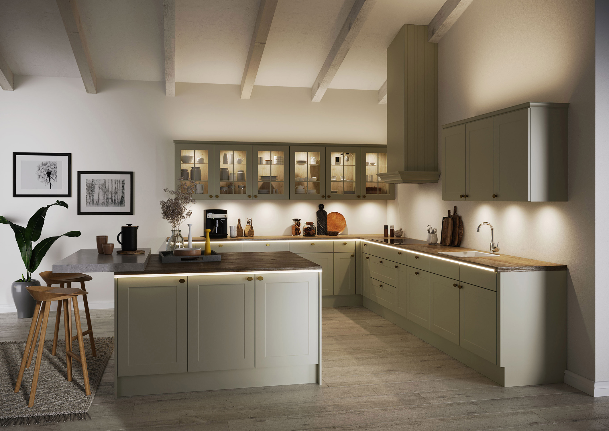 Eine LED-Akzentbeleuchtung in der modernen Landhausküche: Attraktives Zusammenspiel von Spotleuchten über und unter den Hängeschränken, LED-Bändern unter den Arbeitsplatten und beleuchteten Vitrinenschränken. (Foto: AMK)Â