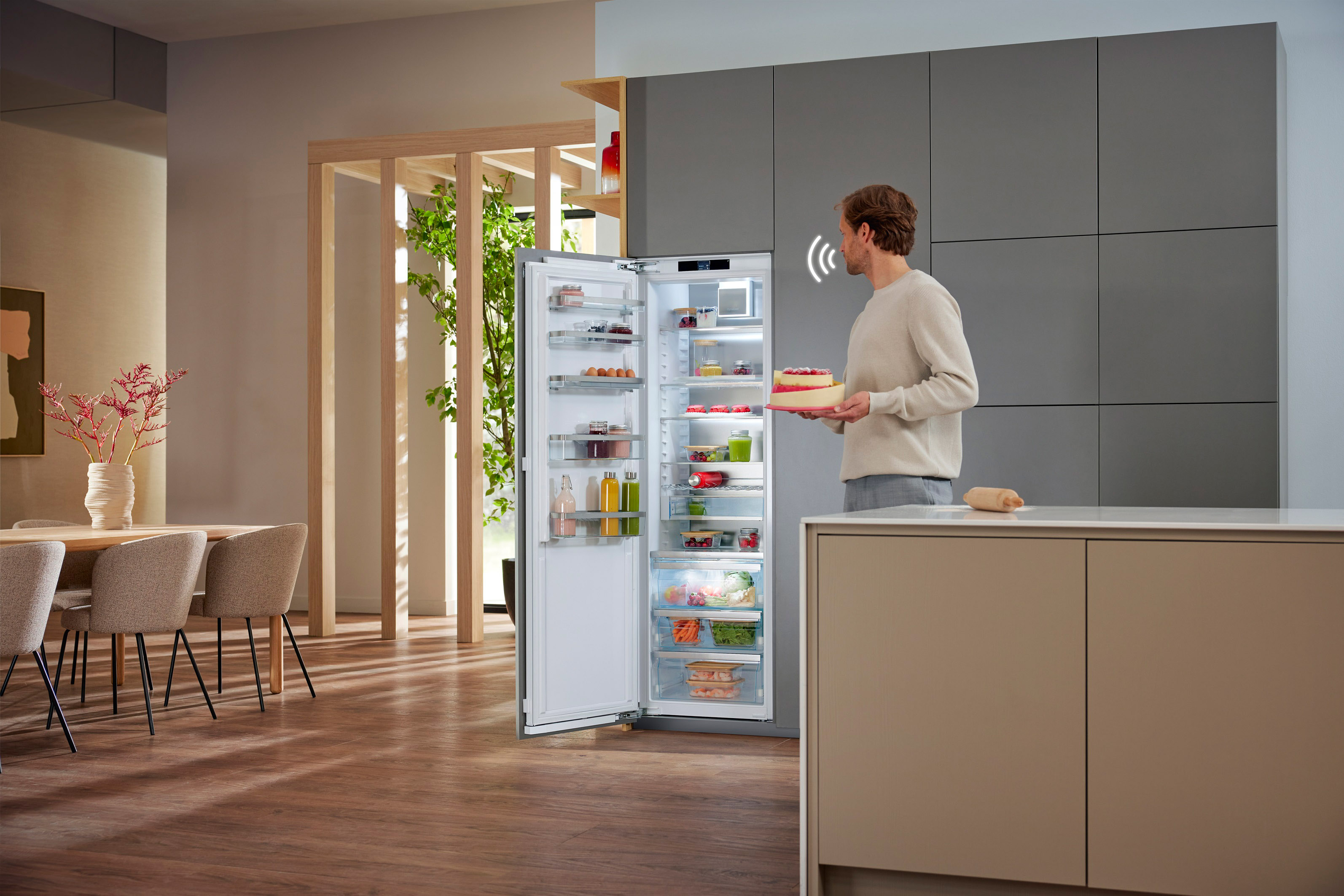 Keine lästigen Fingerabdrücke mehr am Kühlschrank – dies wird durch ausgefeilte Assistenzsysteme möglich: Die Kühlschranktür öffnet sich per Sprachsteuerung oder durch leichten Druck, ohne dass vom Kochen verschmutzte Hände zum Einsatz kommen. Eine in den Kühlschrank integrierte Kamera erlaubt von überall einen Blick auf den Inhalt. Dies erweist sich zum Beispiel dann als praktisch, wenn beim Einkauf im Supermarkt die Zutaten für das Abendessen geplant werden müssen. Wird versehentlich die Tür des Kühl- oder Gefrierschranks nicht richtig geschlossen, erfolgt eine Warnmeldung auf das Smartphone.