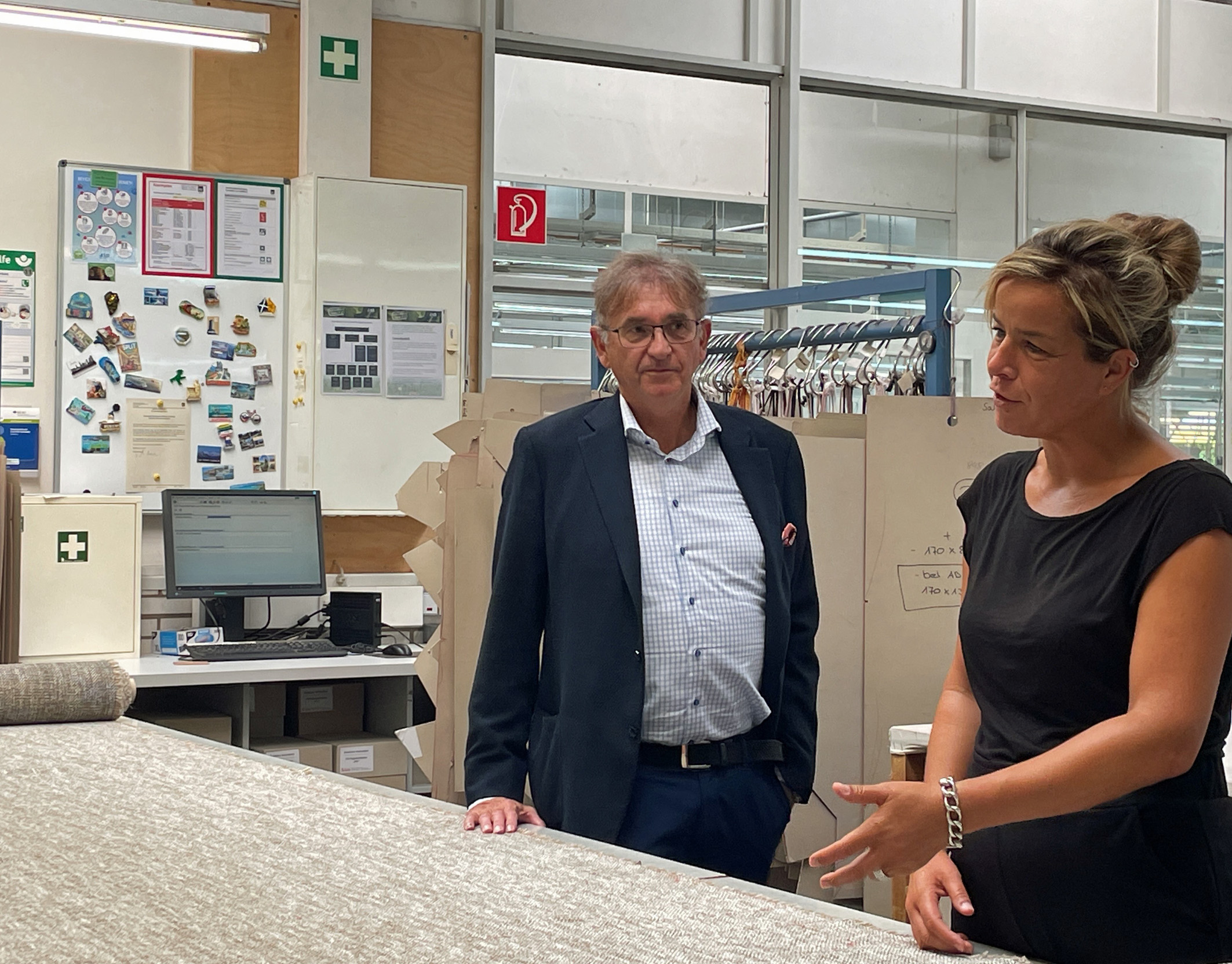 Bild 1: Zu Besuch bei den Bielefelder Werkstätten: Der geschäftsführende Gesellschafter Stephan Anstoetz (l.) zeigte Mona Neubaur (r.), Ministerin für Wirtschaft, Industrie, Klimaschutz und Energie des Landes Nordrhein-Westfalen, die Polstermöbelproduktion am Stammsitz in Bielefeld. Foto: VDM/VHK