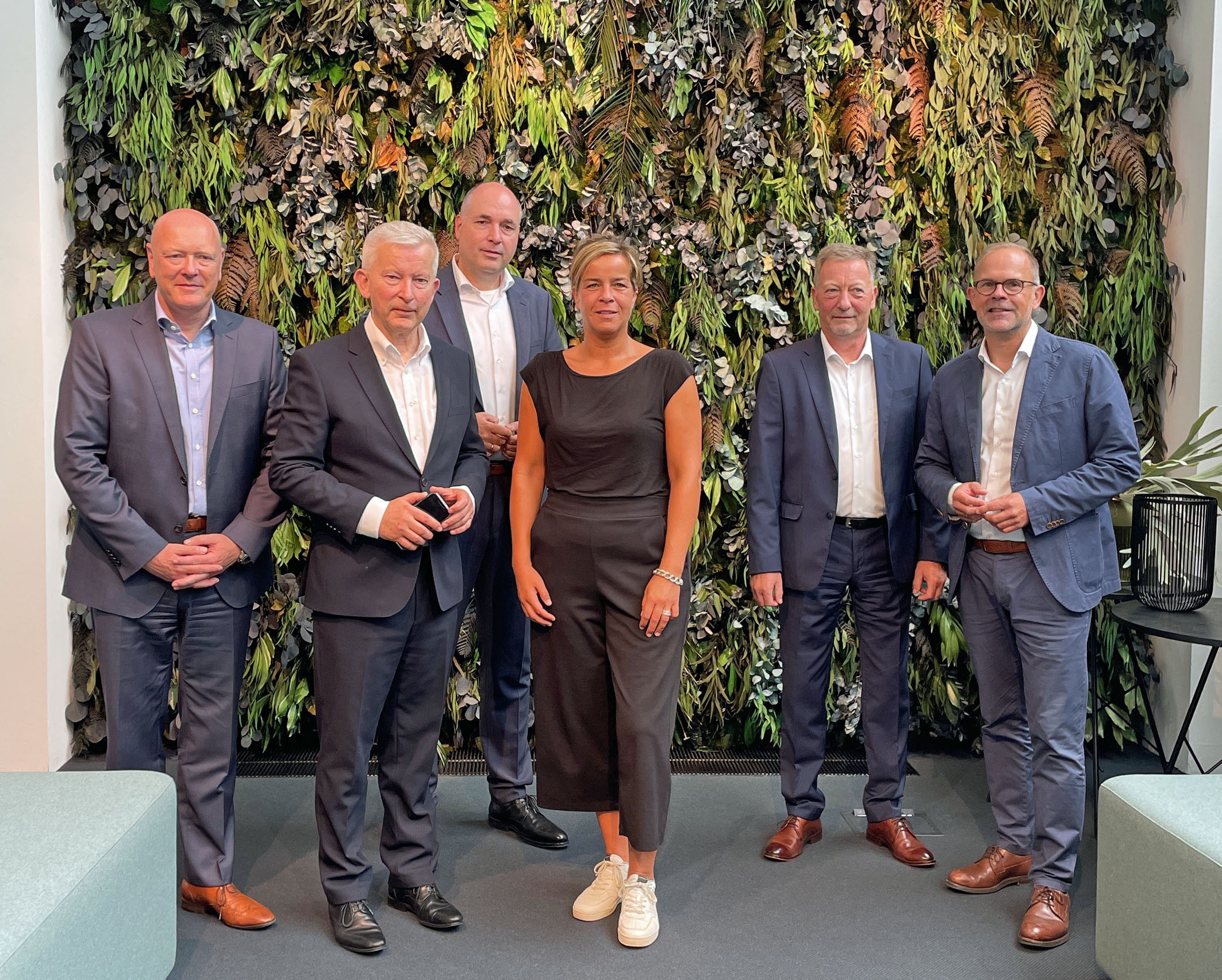 Bild 3: Zu Besuch bei Nolte Küchen: NRW-Wirtschaftsministerin Mona Neubaur (m.), die Geschäftsführer Rüdiger Schliekmann, Manfred Wippermann, Torben Karasek und Heiko Maibach sowie Verbandsgeschäftsführer Jan Kurth (v.l.n.r.). Foto: VDM/VHKÂ