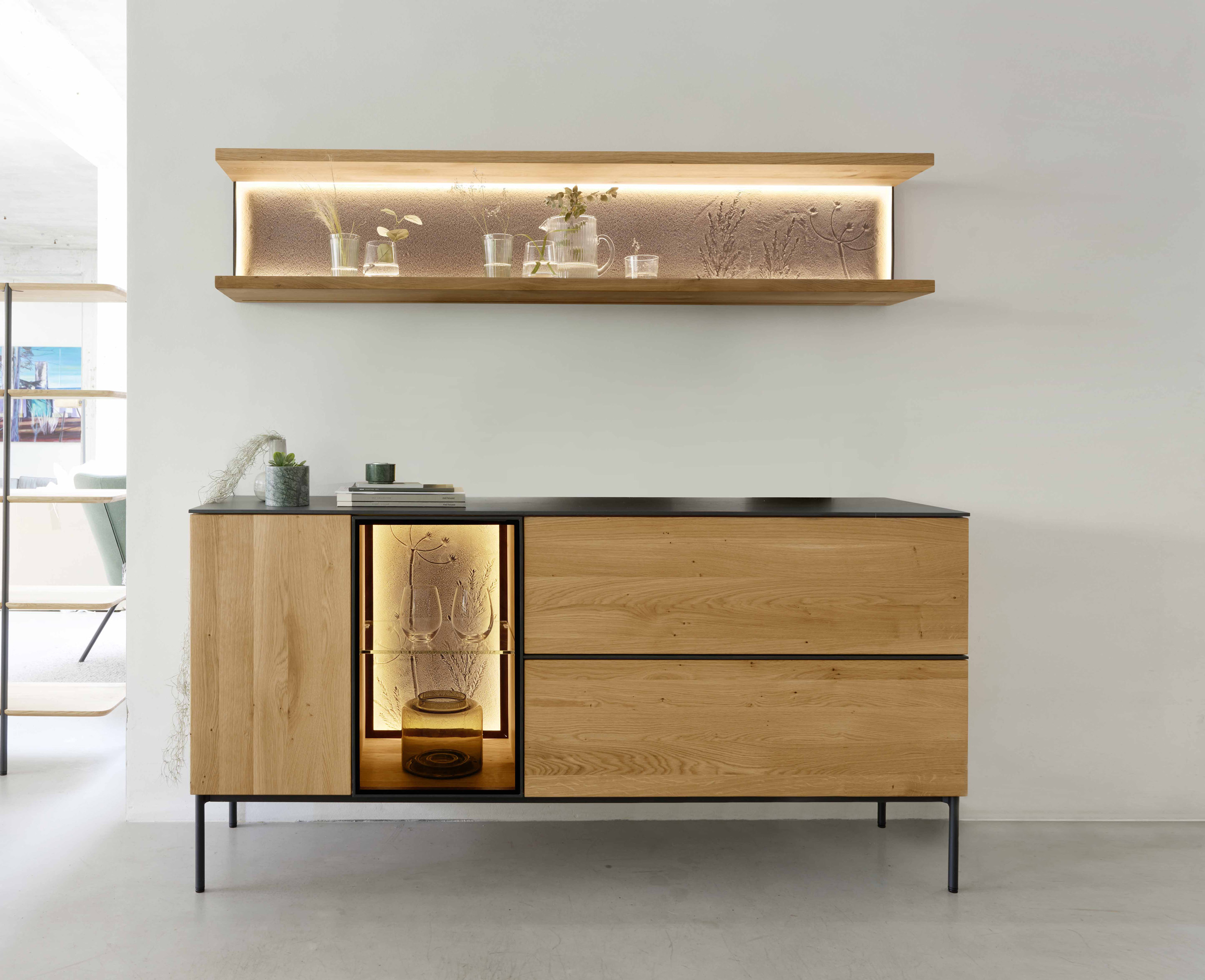 Neben der gesundheitlichen Wirkung ist diese Materialkombination auch ein optisches Highlight in den eigenen vier Wänden. Der Lehm wird dazu für jedes Massivholzmöbel individuell auf die Möbelfronten aufgetragen und mit einem floralen Muster verziert. Der sanfte Farbton vom Lehm, kann in einer zunehmend hektischen Zeit für die nötige Erdung und Ruhe sorgen. „Filigrane Farne und Gräser, die als Abdruck im Lehm verewigt sind, schaffen ein natürliches Gegenbild zu einem technisierten Alltag. Ein wunderschönes Beispiel für zeitgemäßes Design, das auf die natürliche Schönheit und Nachhaltigkeit setzt“, berichtet Thür. Zudem weisen die Möbel ein luftiges Design mittels schmalen Holzrahmen sowie Klarglas auf und runden dabei das moderne Aussehen charmant ab. Auf den großzügigen Möbelfronten erstrahlt die lebendige Maserung der rustikalen Asteiche dank der in Weiß geölten Oberfläche. „In Kombination mit klaren Formen und eleganten Metallelementen in Schwarzgrau entsteht ein zeitloser Stil, der Ruhe und Harmonie ausstrahlt. Dies sorgt für eine angenehme Stimmung Tag für Tag – zum Durchatmen, Entspannen und Kraft tanken“, schließt Thür. IPM/RS