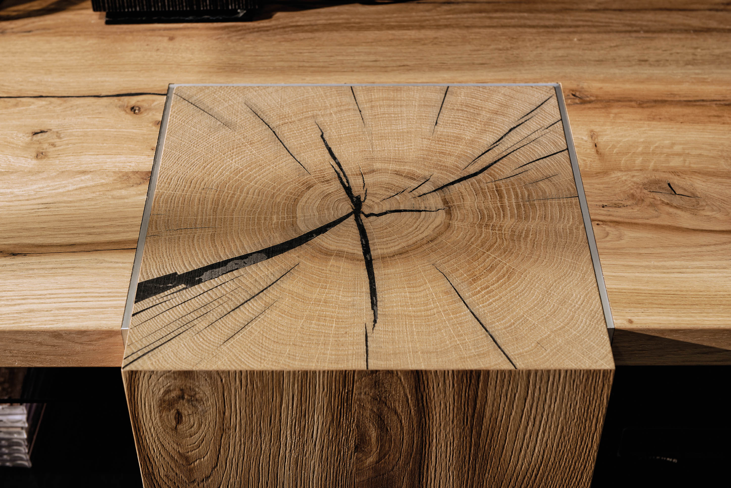 Die Stirnholzseite eines Holzelements ist die Seite, an der die Jahresringe des einstigen Baumes gut erkennbar sind. Bei Massivholzmöbeln wie Esstischen findet sich die Stirnholzseite auch oftmals an der Stirnseite des Tisches wieder – also dort, wo jemand vor Kopf sitzt. Das hat den Hintergrund, dass die Holzfasern durchgehend über die gesamte Länge des Tischs verlaufen und diesen damit besonders robust und stabil machen. Eine sehr auffällige Stirnholzseite weist beispielsweise Eichenholz auf. Die Poren der Eiche sind mit dem bloßen Auge mühelos zu erkennen, da sie an kleine Nadelstiche zwischen den Jahresringen erinnern. Die Poren, die im Frühjahr gewachsen sind, sind dabei meist etwas größer als jene, die innerhalb einer Wachstumsschicht im Herbst entstanden sind. Die unterschiedlichen Porengrößen lassen sich auf die Wasserversorgung des Baums zurückführen: Im Frühjahr und Sommer benötigt der Baum mehr Wasser für sein Kronendach als im Herbst und Winter – entsprechend sind die Poren etwas stärker ausgeprägt und auf der Stirnholzseite eines Möbelstücks aus Massivholz besser zu erkennen.