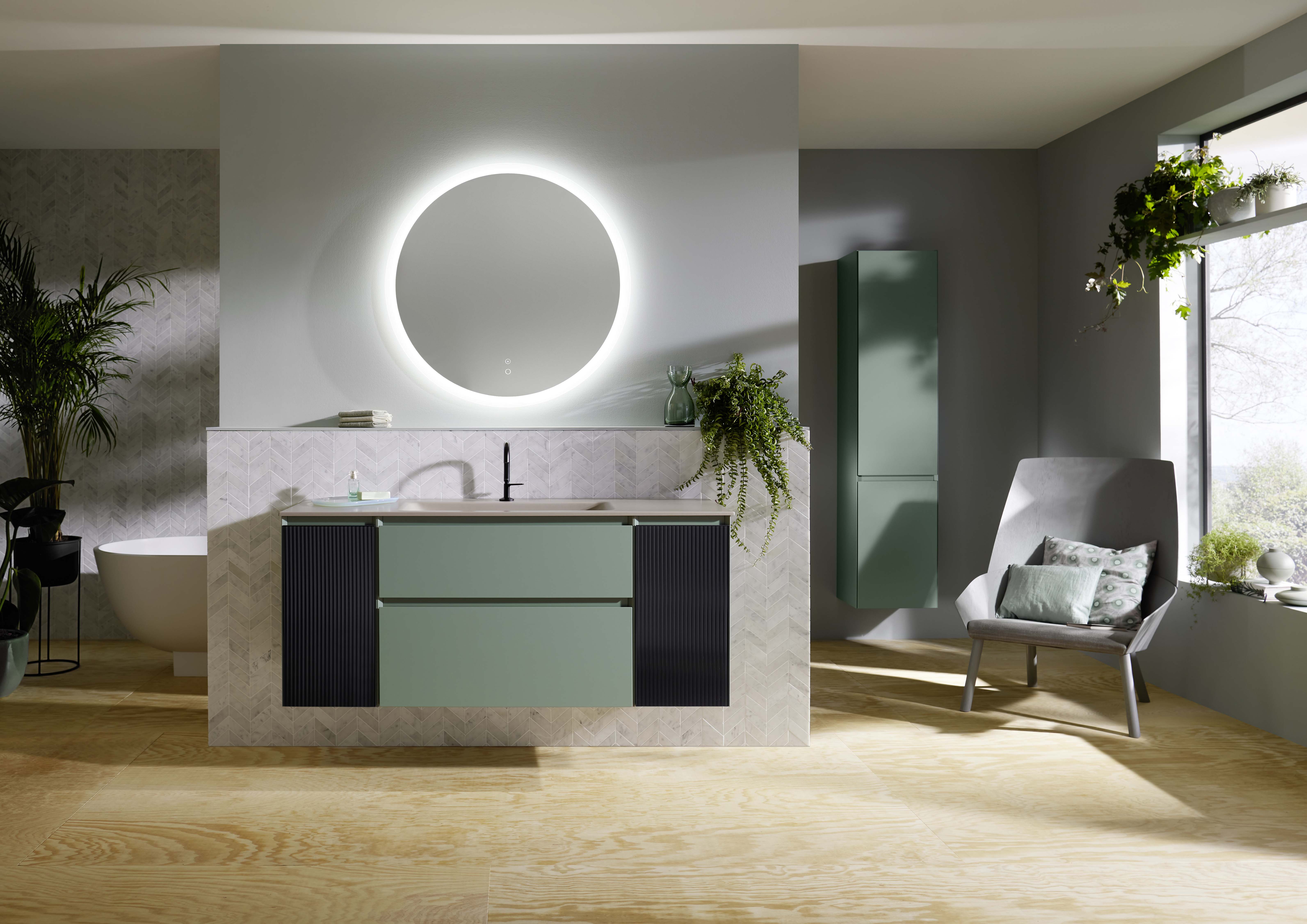 Die den Küchen beliebte Rillenoptik hält auch im Badezimmer Einzug, hier als dunkle Rillenglastüren kombiniert mit der Farbe Salbeigrau. Foto: Burgbad