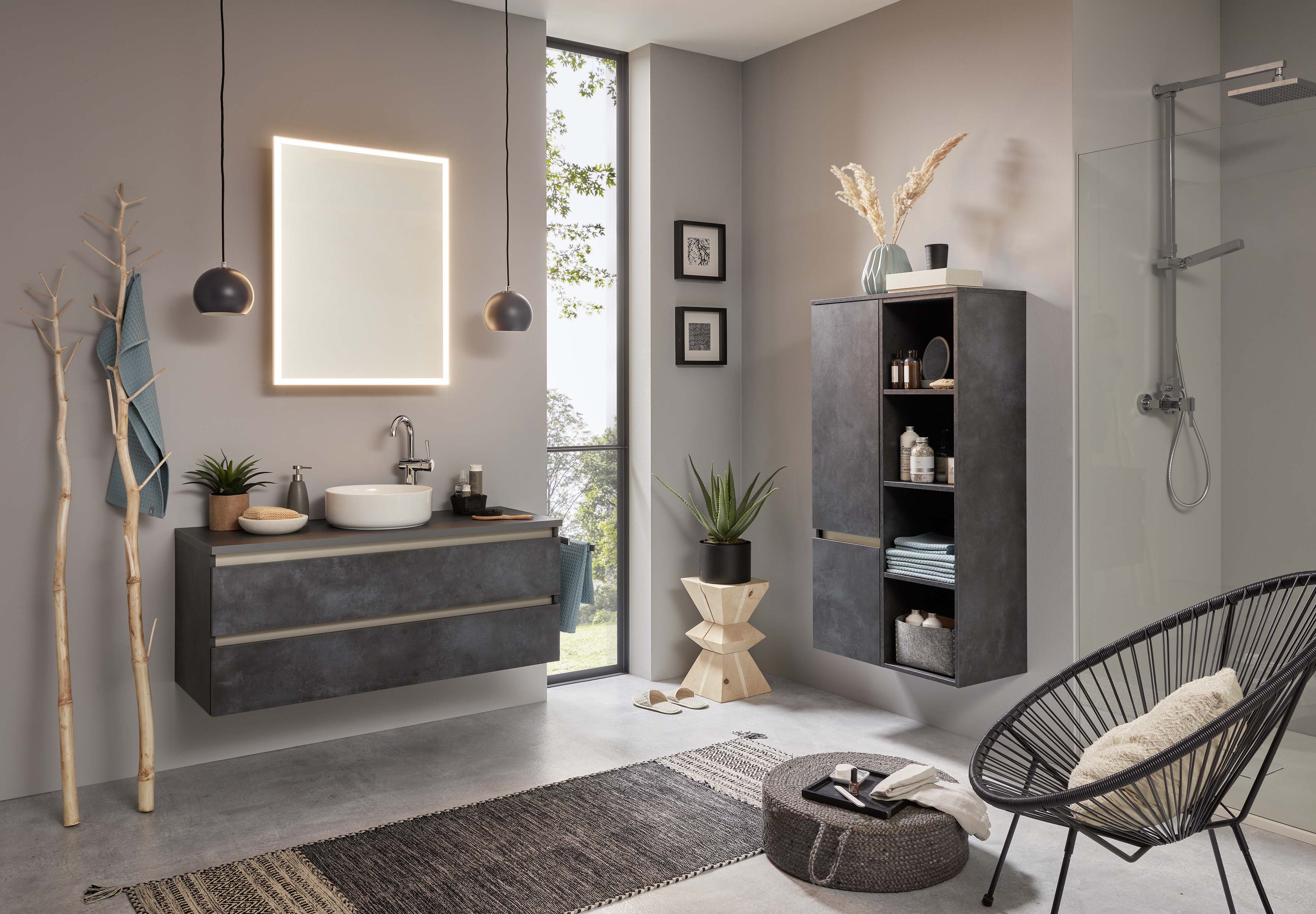 Ein gemütliches Ambiente lässt sich beispielsweise kreieren, indem für den Waschtisch und die Schränke Hochglanz- oder Mattlackoberflächen in Creme-, Beige- oder hellen Grautönen mit Holzdekoren oder Echtholzfurnieren kombiniert werden. Beliebt sind hier vor allem Eiche und Nussbaum. Immer häufiger kommt im Bad auch Massivholz zum Einsatz. Die natürliche Zellstruktur des Holzes kann gut mit schwankender Luftfeuchtigkeit umgehen und das Raumklima positiv beeinflussen. Filigrane Regale und offene, beleuchtete Fächer im Waschtisch sorgen für eine leichte Optik; dazu passt etwa ein weißes Aufsatzwaschbecken mit mattschwarzer Armatur. Zunehmend Einzug in das Badezimmer halten die aus der Küche bekannten Rillenfronten – als ganz besonderer Hingucker. Holz findet sich auch als dekoratives Element an den Wänden, häufig in Form von schlanken Paneelen. Auf dem Boden strahlen großformatige Steinfliesen Natürlichkeit aus.