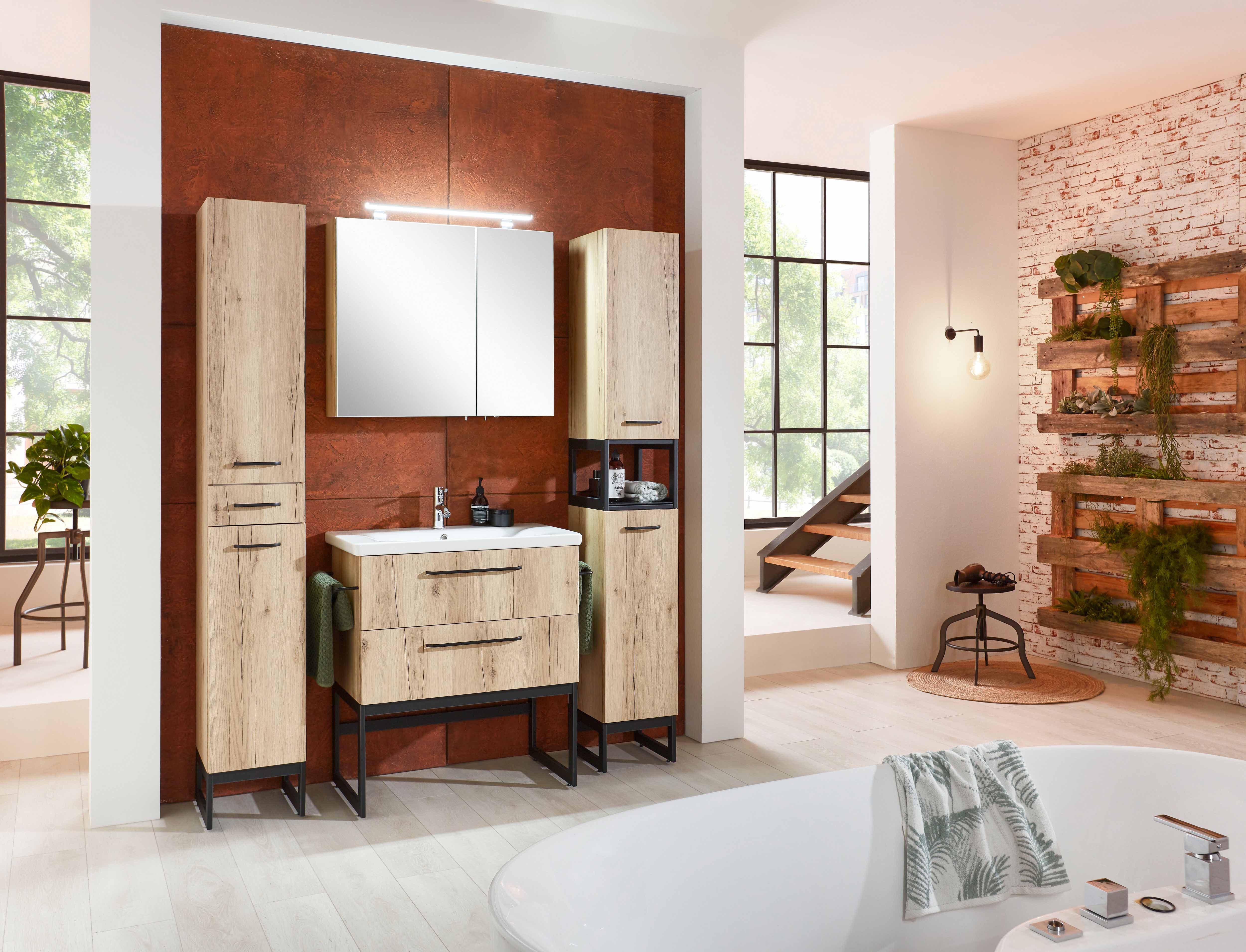 Die Badmöbel in Wildeiche-Optik können freistehend aufgestellt werden. Foto: JAKA-BKL