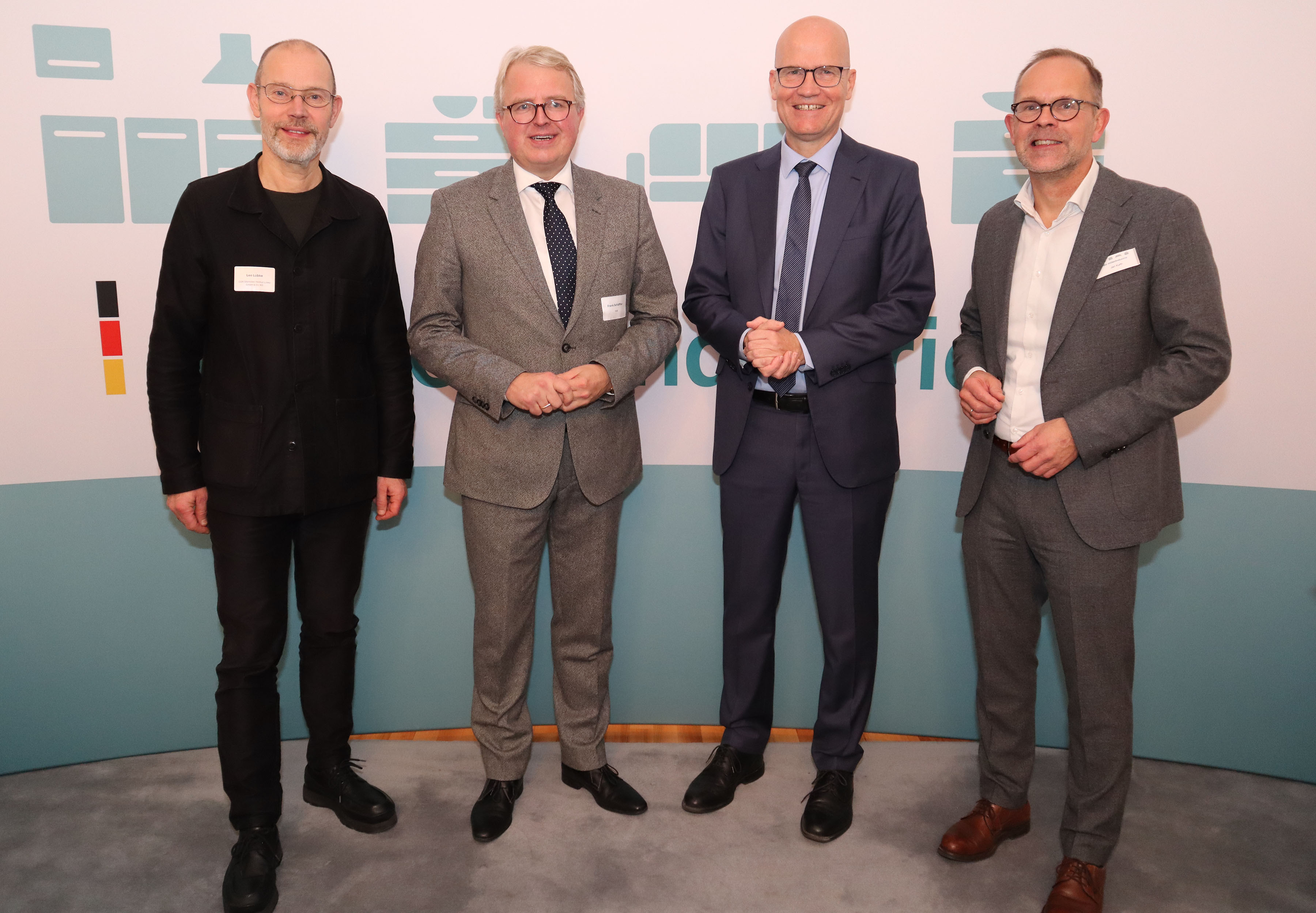 Bild 1: Diskussionsrunde beim Parlamentarischen Abend (von links): VDM-Präsident Leo Lübke, Frank Schäffler (FDP), Ralph Brinkhaus (CDU) und VDM-Hauptgeschäftsführer Jan Kurth. Foto: VDM/VHK