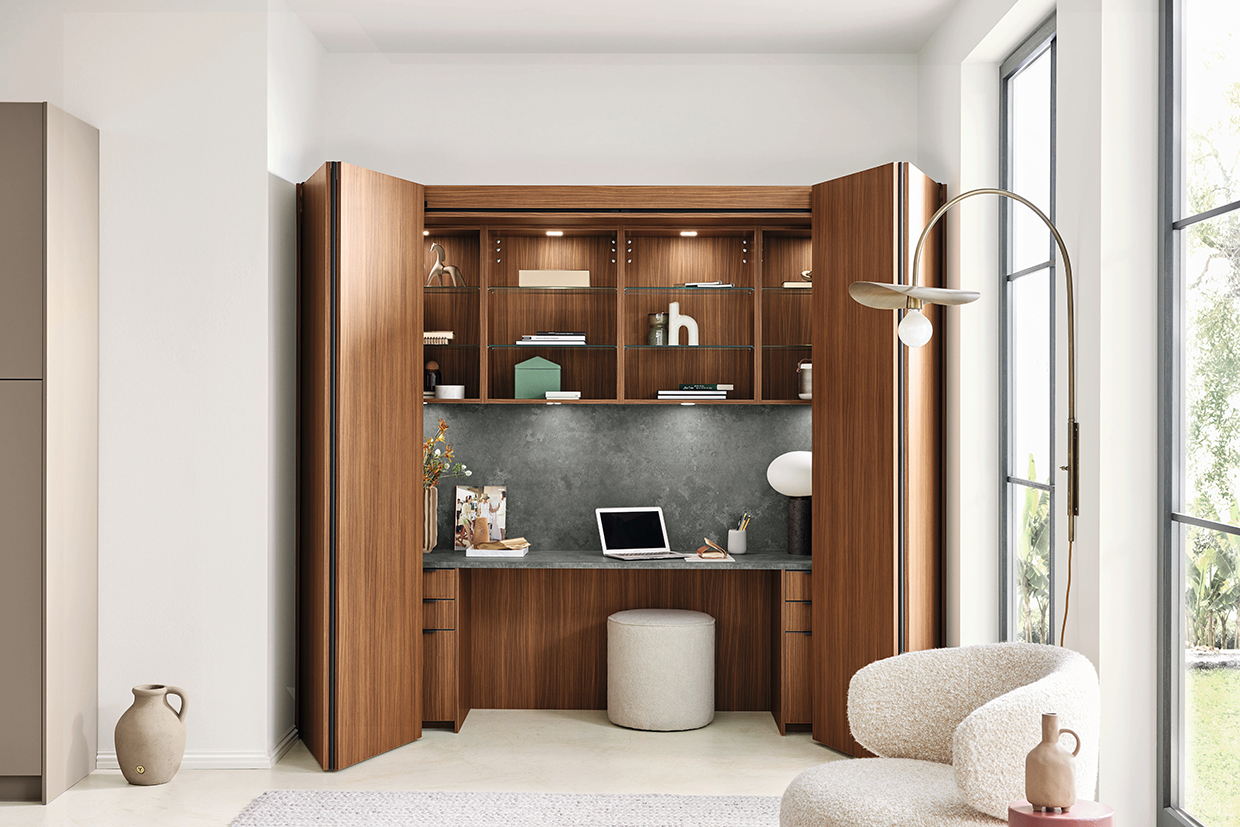 Der heimische Büroplatz lässt sich nach getaner Arbeit hinter den eleganten Falt-Schiebetüren verbergen. (Foto: AMK)