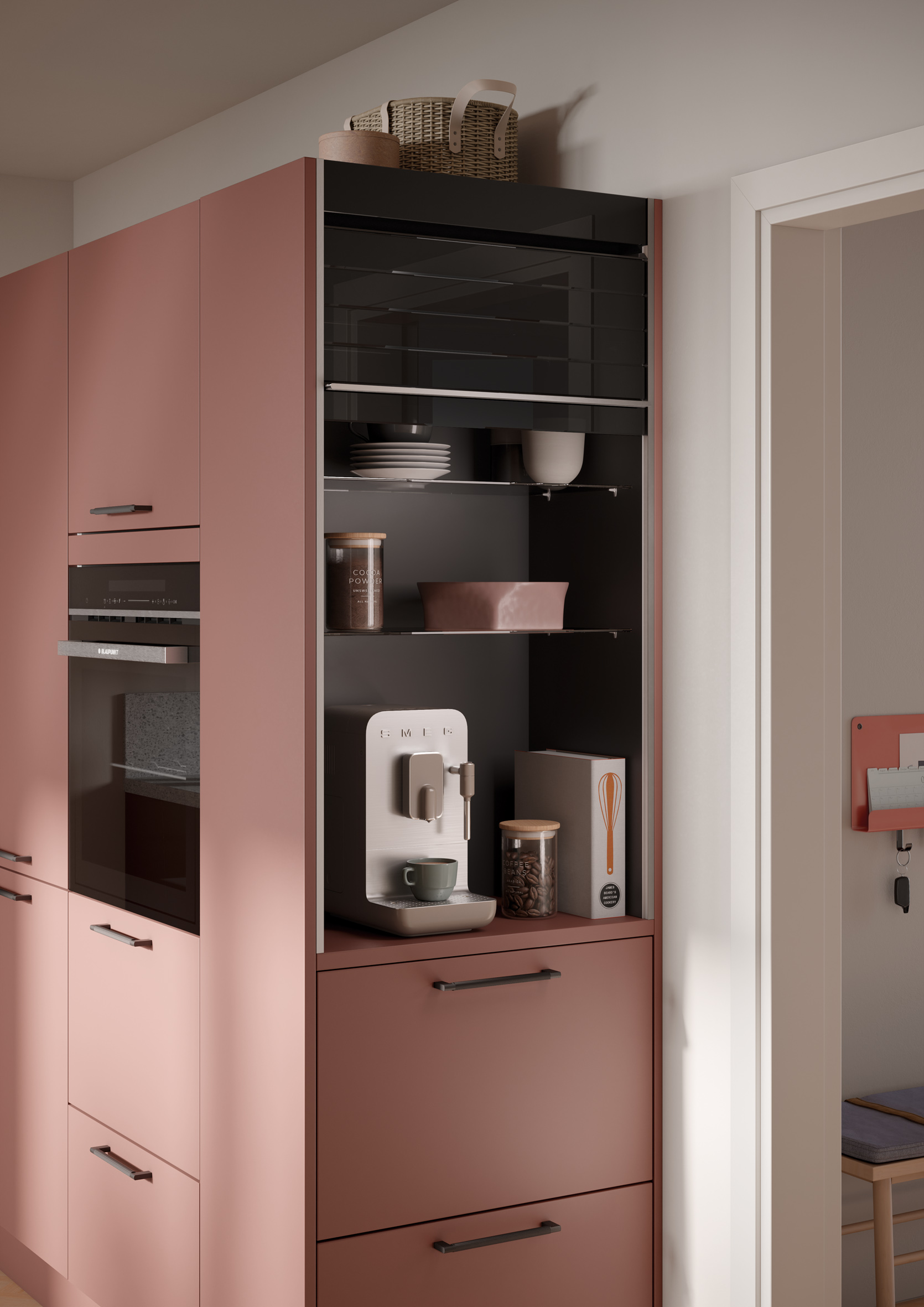 Eine schöne Idee besonders für kleine Küchen: Diese Hochschrankzeile ist auch von der Seite nutzbar, etwa als kleine Kaffeebar. (Foto: AMK)