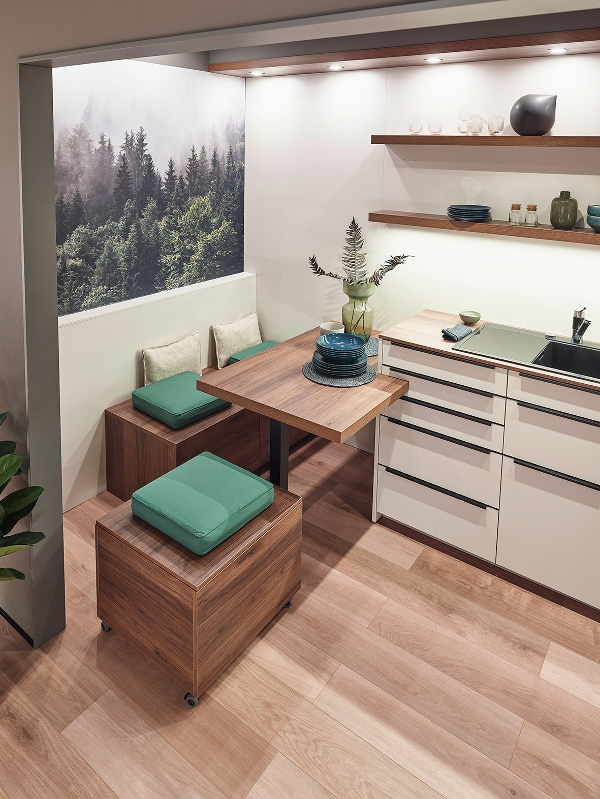 Viele Funktionen auf kleinem Raum: Sogar einen Homeoffice-Platz bietet diese Küchenlösung für kleine Appartements. (Foto: AMK)