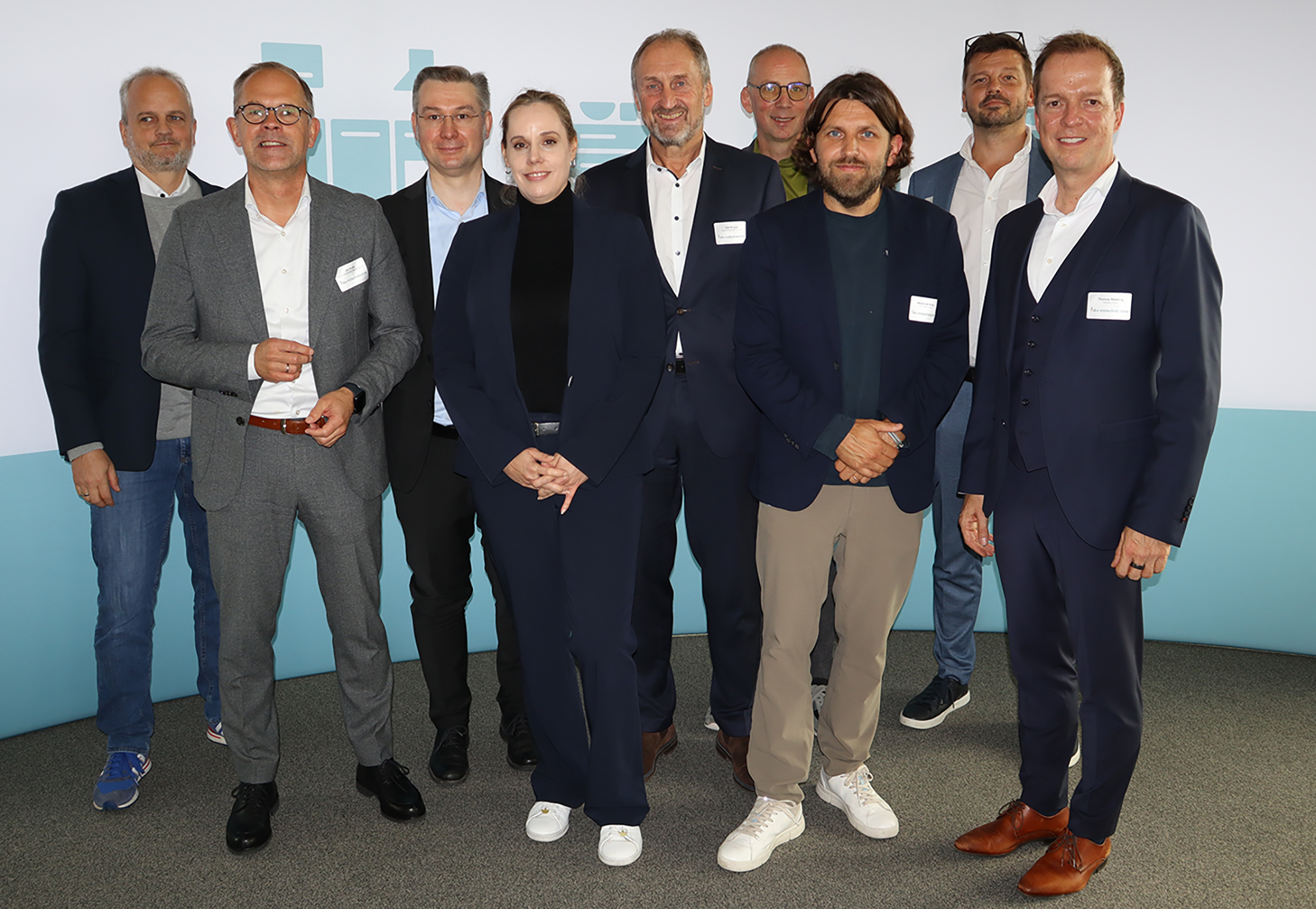 Bild 1: Referierten und diskutierten über den digitalen Produktpass (von links nach rechts): Alexander Rhetz (Otto), Jan Kurth (VDM/VHK), Christoph Attila Kun (BASF), Nina Stock (BMWE), Dirk Krupka (Häcker Küchen), Olaf Plümer (DCC), Alexander König (GS1 Germany), Patrick Sönke (Integrated Worlds) und Thomas Rödding (Narravero). Foto: VDM/VHK