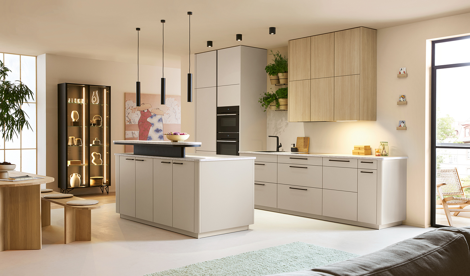 Bild 2: Die elegante Japandi-Küche besticht durch eine Schrankfront mit einem filigranen Rahmen. (Foto: Pronorm Einbauküchen)