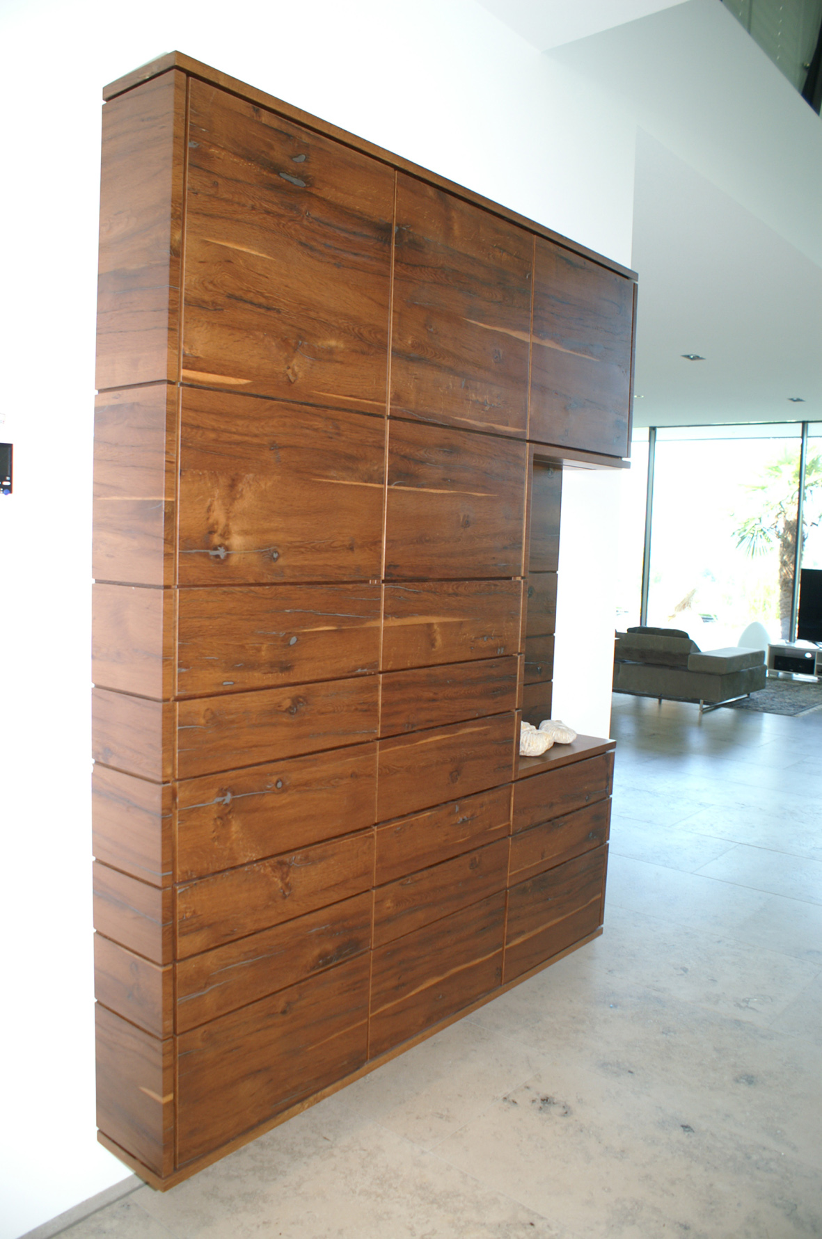 Zu Beginn der Überlegungen war noch nicht ganz klar, welches Ausmaß die Oberflächenveredlung mit feinem Furnier letztendlich annehmen würde. „Wir haben gut drei Wochen lang miteinander alle Möglichkeiten intensiv erörtert. Sowohl hinsichtlich möglicher Holz-sorten, als auch hinsichtlich gänzlich anderer Oberflächenmaterialien. Am Ende war dann klar: Es soll mindestens 80 Jahre altes Altholz-Furnier sein und zwar für alle Holzmöbel des Eigenheims“, so Thoma. Das Ausgangsmaterial stammt aus Eichenbalken, die im Dachstuhl einer alten Mühle aus der Provence verbaut waren. Es wurde gemessert und auf eine Stärke von rund 1,5 Millimetern gebracht. „Die recht große Stärke bringt noch mehr Tiefe in das sehr interessante Erscheinungsbild des Altholz-Furniers. Es harmoniert perfekt mit den weiteren modernen Baustoffen des Hauses und ergänzt diese in unnachahmlicher Weise“, erklärt der Unternehmer und ergänzt: „Wir sind froh, dass die gute Beratung im Vorfeld zu der Entscheidung des Bauherren geführt hat, sein gesamtes Haus zu einem einmaligen Unikat zu machen.“