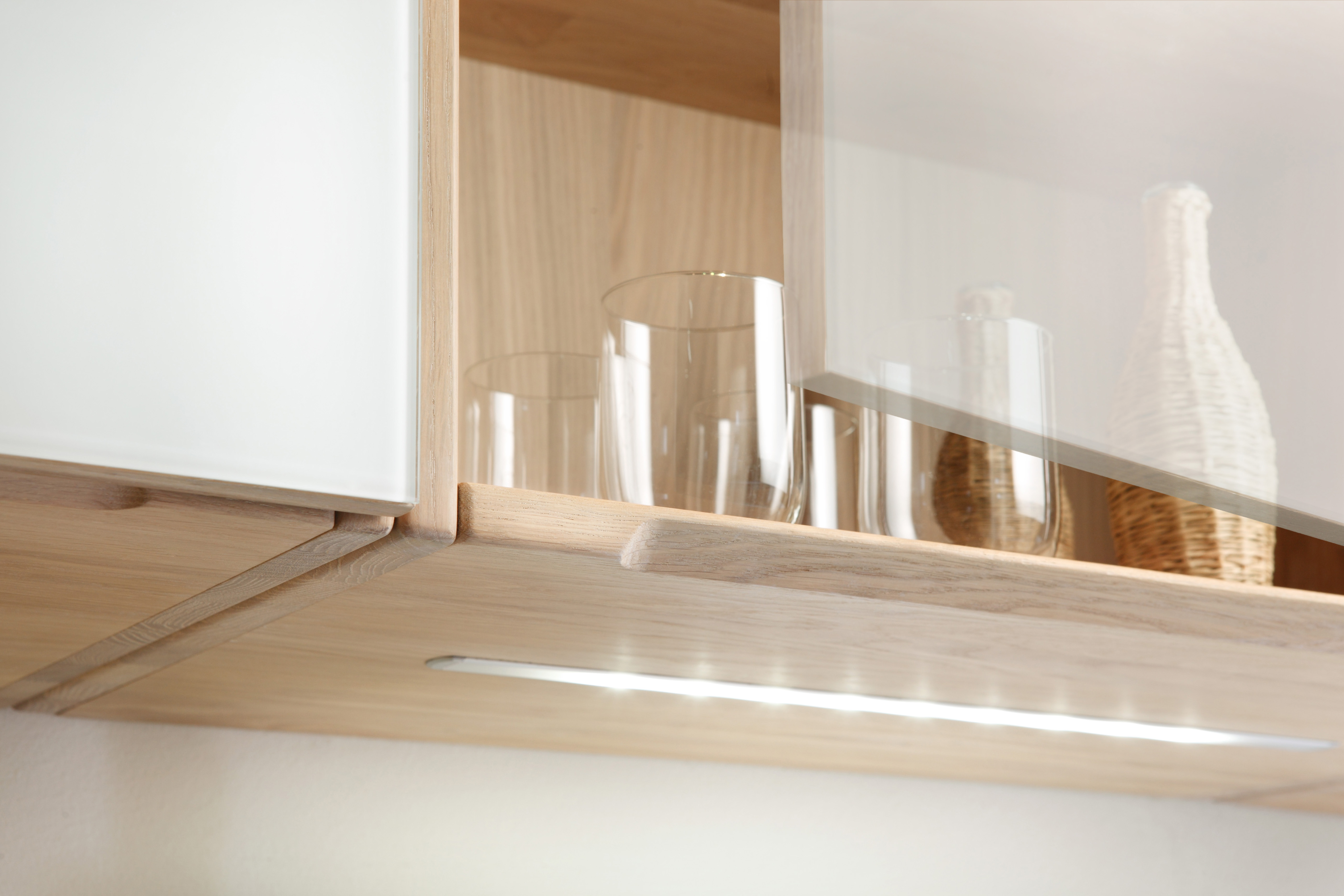 Moderne Massivholzmöbel werden filigraner: Ob in (Altholz-)Eiche, Kernbuche, Nussbaum, Erle oder den angesagten Trendhölzern Wildeiche und Wildnuss – die Korpusse präsentieren sich schlanker und leichter, was die Möbel anpassungsfähiger an verschiedene Einrichtungsstile macht. „Dazu verleihen ihnen runde Ecken, abgeschrägte Kanten und fließende Übergänge eine organische, lebendige Form“, so Ruf. Raffinierte Detaillösungen sorgen für willkommene Abwechslung im Erscheinungsbild: So auch Schubladeneinheiten, die elegant über die Grundtiefe der Arbeitsplatte hinaus hervorgearbeitet sind. Pfiffige Einschubelemente und Regalböden in den verschiedensten Formen und Maßen bieten eine Vielzahl an Ablageflächen und Sortiermöglichkeiten. Ein weiteres Augenmerk haben die Massivholzhersteller auf die Hintergrundbeleuchtung gelegt. Diese ist oftmals derart in die Regal- oder Glasböden beziehungsweise Rück- oder Seitenwände integriert, dass man gar nicht erkennen kann, wo sich die modernen LED-Lämpchen befinden.