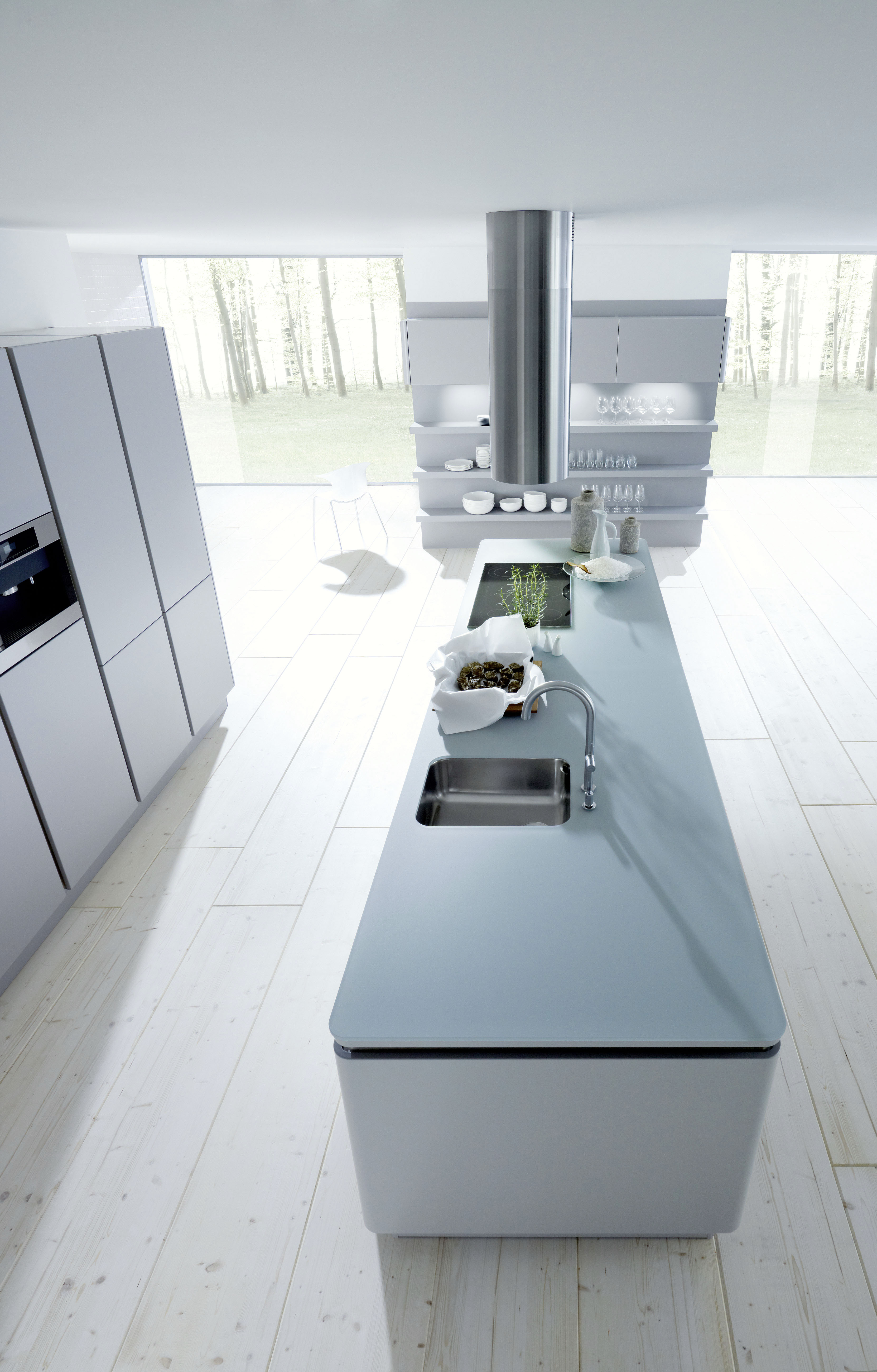 Sanft gerundet, hochwertig verarbeitet, elegant-zeitlos in der Anmutung. Diese Glasarbeitsplatte passt farblich perfekt zu den Möbelfronten in Mattlack. (Foto: AMK)