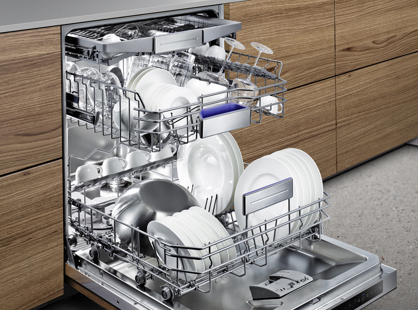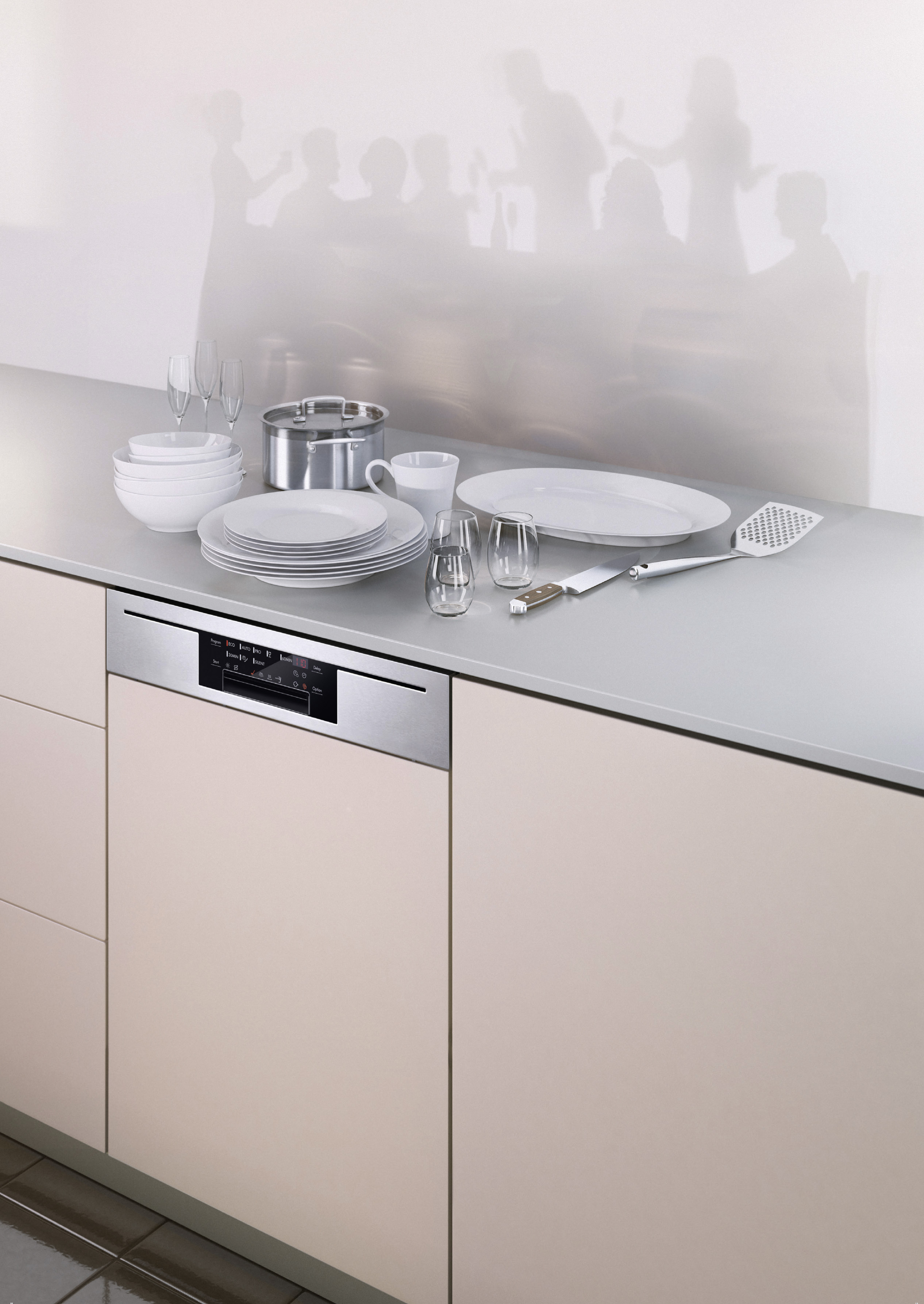 In offenen Wohnküchen – dem begehrtesten Lifestyle-Produkt unserer Zeit – machen sich diese unverzichtbaren Helfer als vollintegrierbare Einbau-Modelle hinter den attraktiven grifflosen Möbelfronten gänzlich unsichtbar. Und da sie so leise spülen und trocknen, zudem auch noch fast unhörbar. „Leise-Spüler“ arbeiten bei Geräuschemissionen zwischen 44 und 39 dB(A); mit der Option Extra leise, falls der günstigere Nachtstromtarif genutzt werden soll, mit noch weniger. Zum Vergleich: Flüstern liegt bei 30 dB.
