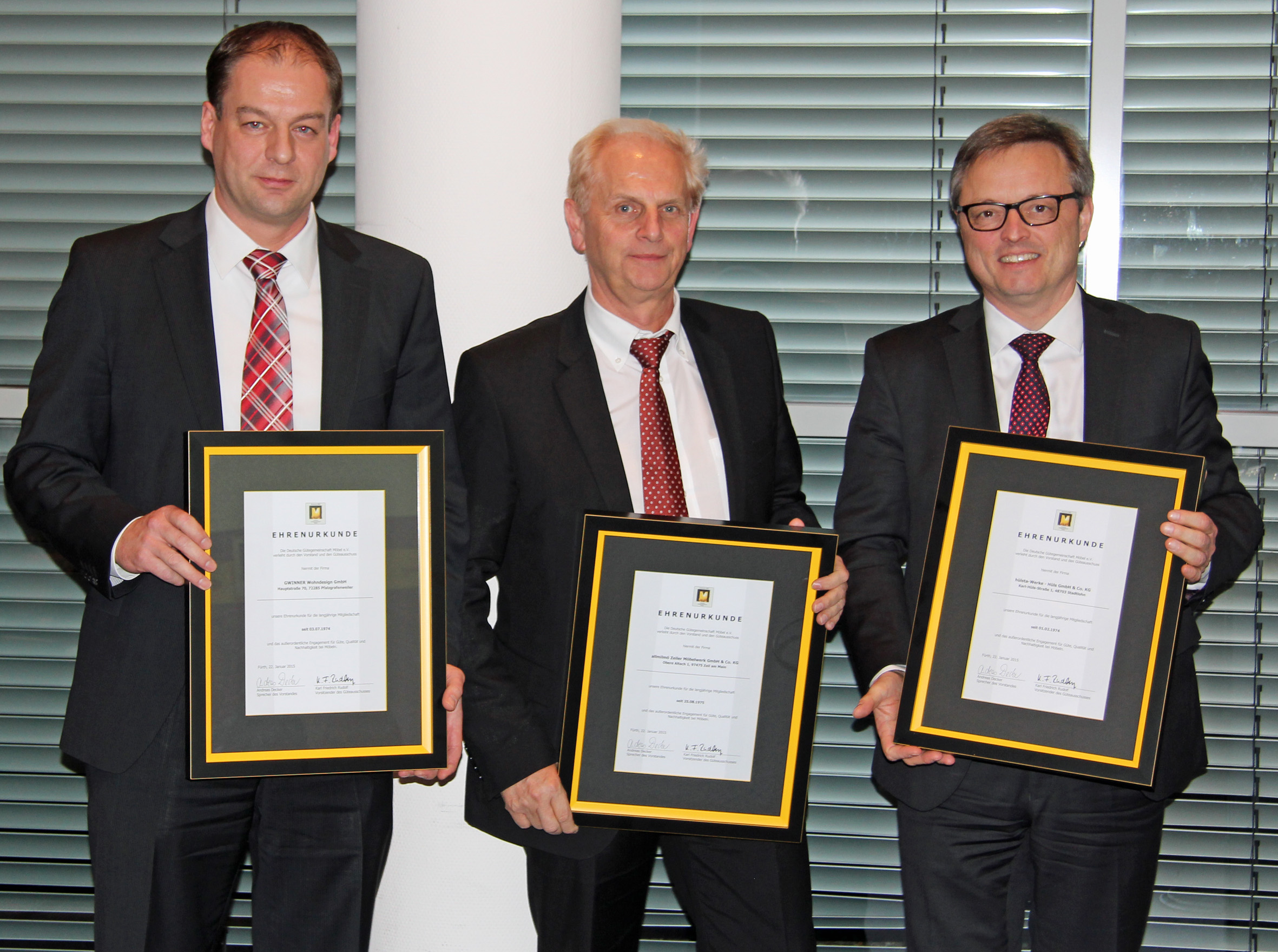 Nahmen die Urkunden für ihre Unternehmen in Empfang: Volker Held (Gwinner Wohndesign), Werner Hörnschemeyer (allmilmö) und Heiner Goossens (hülsta). Foto: DGM