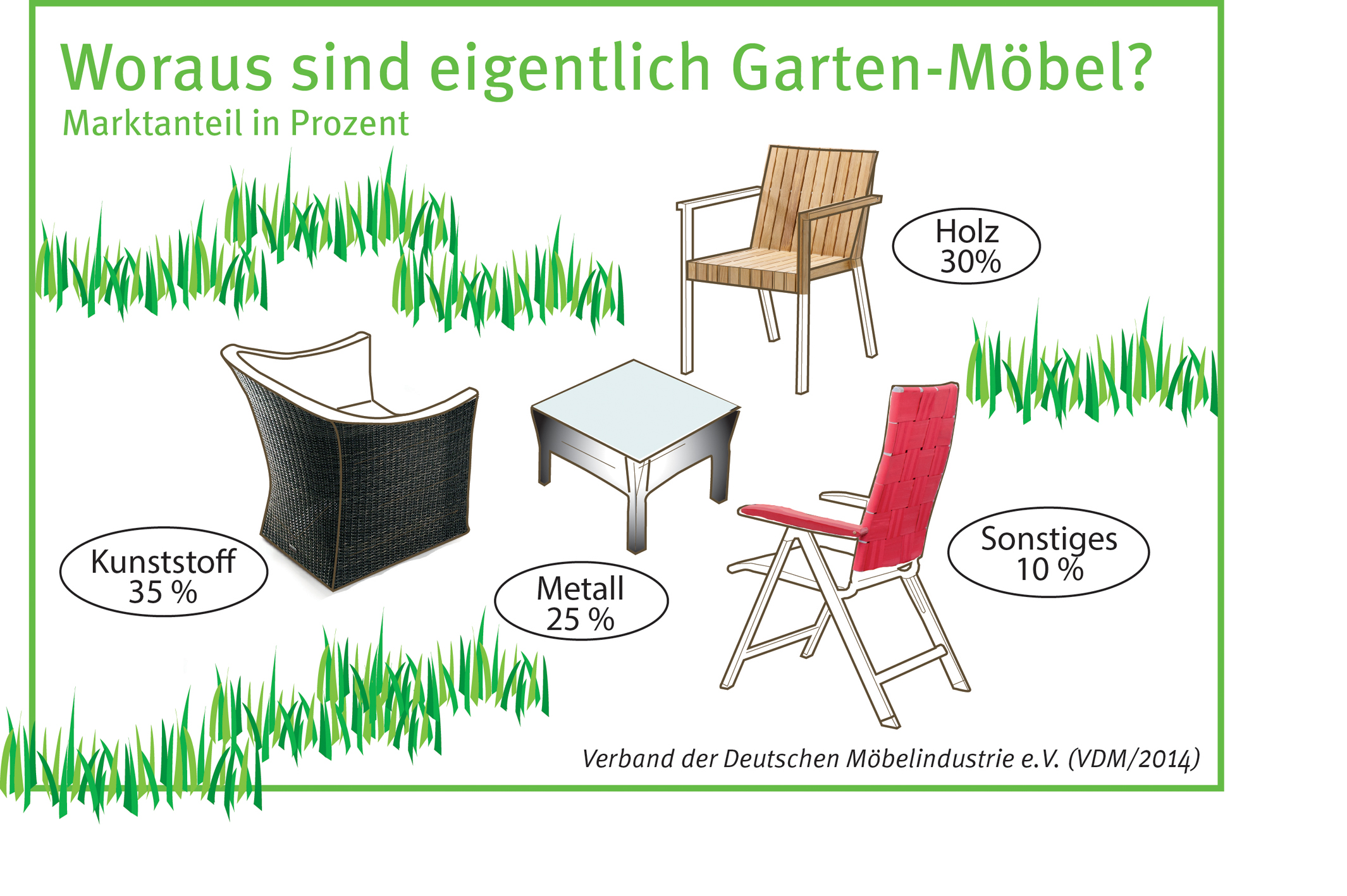 Foto 3: Trend zu mehr Kunststoff: Das Gartenmöbelangebot besteht zu 30 Prozent vorwiegend aus Holz, zu 35 Prozent vorwiegend aus Kunststoff, zu 25 Prozent vorwiegend aus Metall und zu 10 Prozent aus „sonstigen“ Materialien. VDM