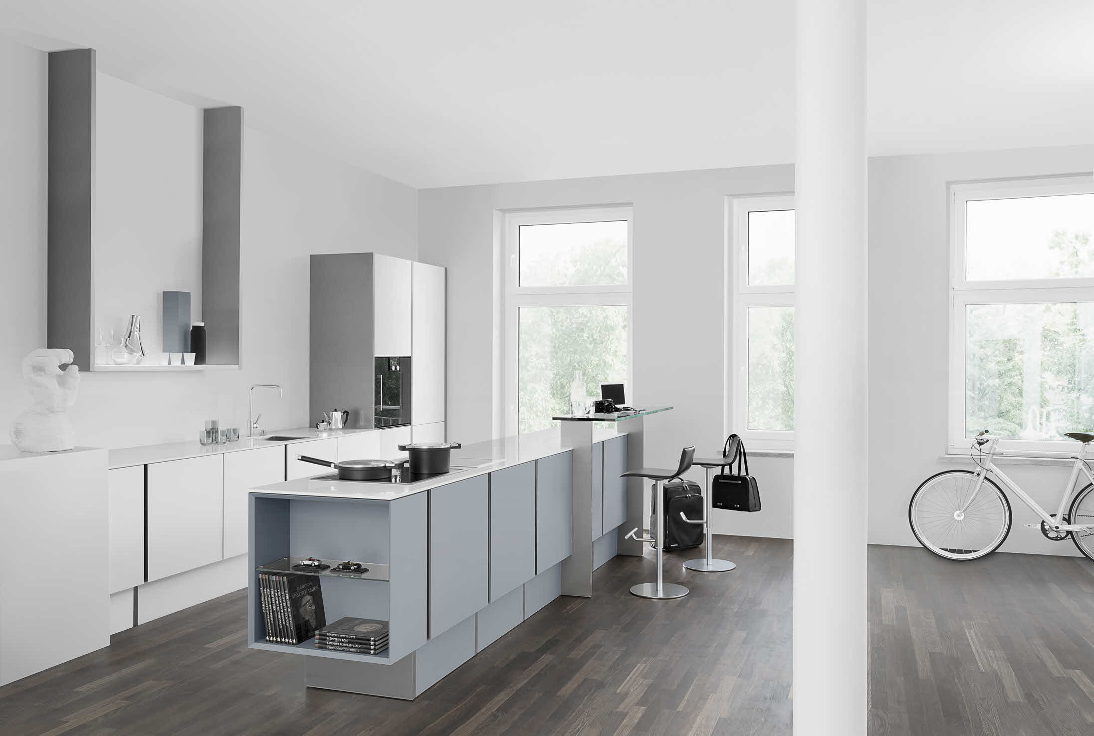 Hochwertig: attraktiver Farb-Mix in Polarweiß und Steingrau. Die Arbeitsflächen sind aus pflegeleichtem Quarzwerkstoff. (Foto: AMK)