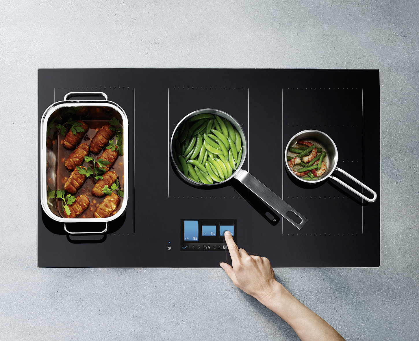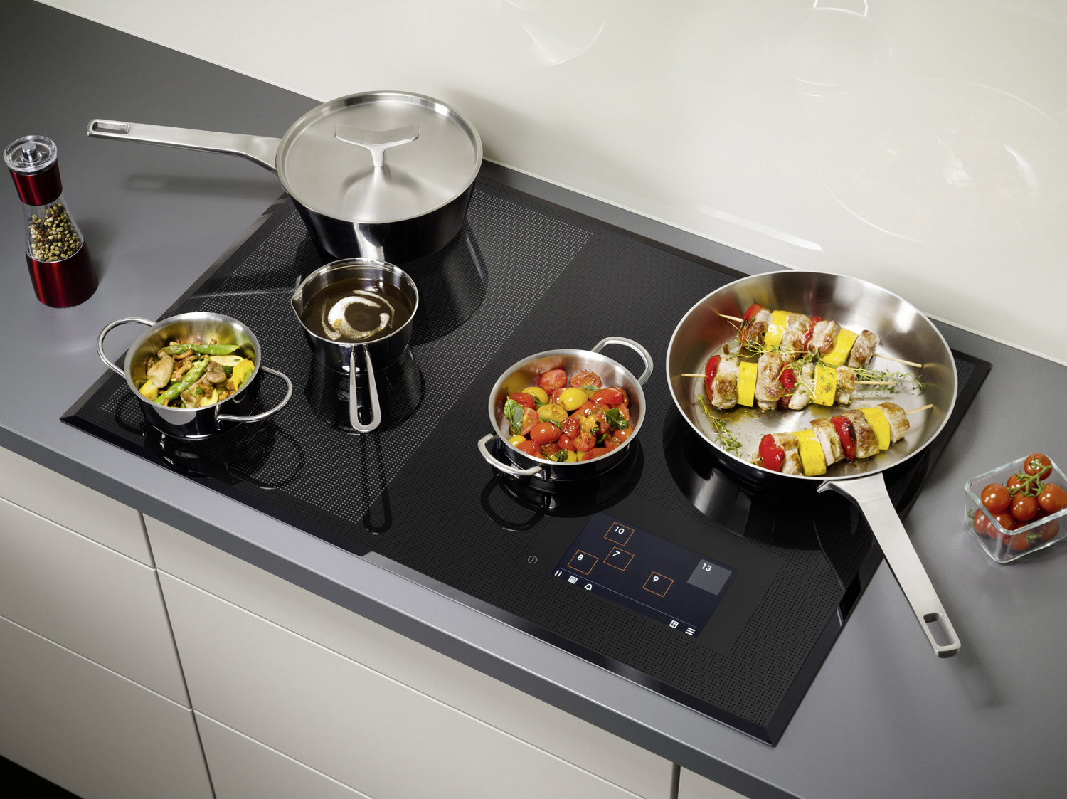 „Was bei vielen Konsumenten ebenfalls ganz oben auf der Wunschliste steht“, so AMK-Geschäftsführer Mangels, „ist die so genannte Flexible Induktion, wie sie Flächen- und in der Premium-Klasse Vollflächeninduktionskochfelder ermöglichen.“ Bei der Flächeninduktion können beispielsweise zwei Kochstellen zu einem großen Areal zusammengeschaltet werden, auf dem dann mehrere Töpfe und Pfannen gleichzeitig Platz haben. Die Position des Kochgeschirrs wird automatisch erkannt, selbst wenn es verschoben wird. Bei der Vollflächeninduktion lässt sich nicht nur ein bestimmtes Areal, sondern die gesamte Glaskeramikoberfläche als flexible Kochstelle nutzen, auf der die Töpfe, Pfannen und Bräter ebenfalls überall erkannt werden, unabhängig von ihrer Größe und jeweiligen Position. Mehr Freiheit und Flexibilität geht nicht mehr.