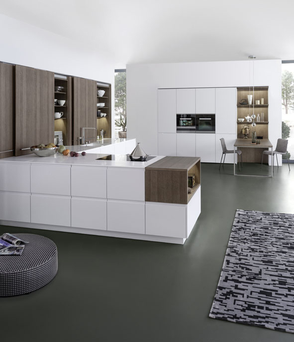 Die Farbtrends bei Küchenmöbeln umfassen derzeit vor allem Töne aus dem Grau-Bereich. Hellgrau, Betongrau, Industriegrau, Mausgrau, Dunkelgrau, bis hin zu Schwarz, stehen in den Produktionshallen der Industrie literweise bereit zum Abruf. Schwarz ist eine sogenannte unbunte Farbe. Sie wirkt vor allem elegant und ob man es glauben mag oder nicht, sie ist unauffällig. Gerade bei Objekten des Luxus lässt der Verzicht auf Farbe den Luxus selbstverständlich erscheinen, wie auch zum Beispiel bei kostbaren schwarzen Limousinen. Schwarz ist Eleganz ohne Risiko. Viele Kunden wollen das noble Schwarz und unterstreichen damit die dezente Wertigkeit ihrer neuen Küche. Schwarz kommt in Fronten, bei Beschlägen, im Schrankinneren aber auch als Keramikspüle vor. Beim Farbton Grau liegt der Fall etwas anders. Schon ein sehr helles Grau wirkt nicht so kühl wie ein hartes Weiß. Grau wirkt außerdem stets elegant und ist pflegeleichter als Weiß. Es lässt sich sehr gut mit warmen Holztönen beispielsweise von der Küchenarbeitsplatte kombinieren. Gerne werden heute auch Frontmaterialien und Farben miteinander kombiniert. So mutet im Oberschrankbereich warmes Kirschbaumfurnier sehr gut mit lackierten grauen Fronten im Unterschrankbereich an. Dazwischen eine gläserne Rückwand statt eines traditionellen Fliesenspiegels mit zum Beispiel einem frischen blattgrünen Uniton und schon sind drei verschiedene Farbfamilien im Einsatz, die zusammen harmonieren.